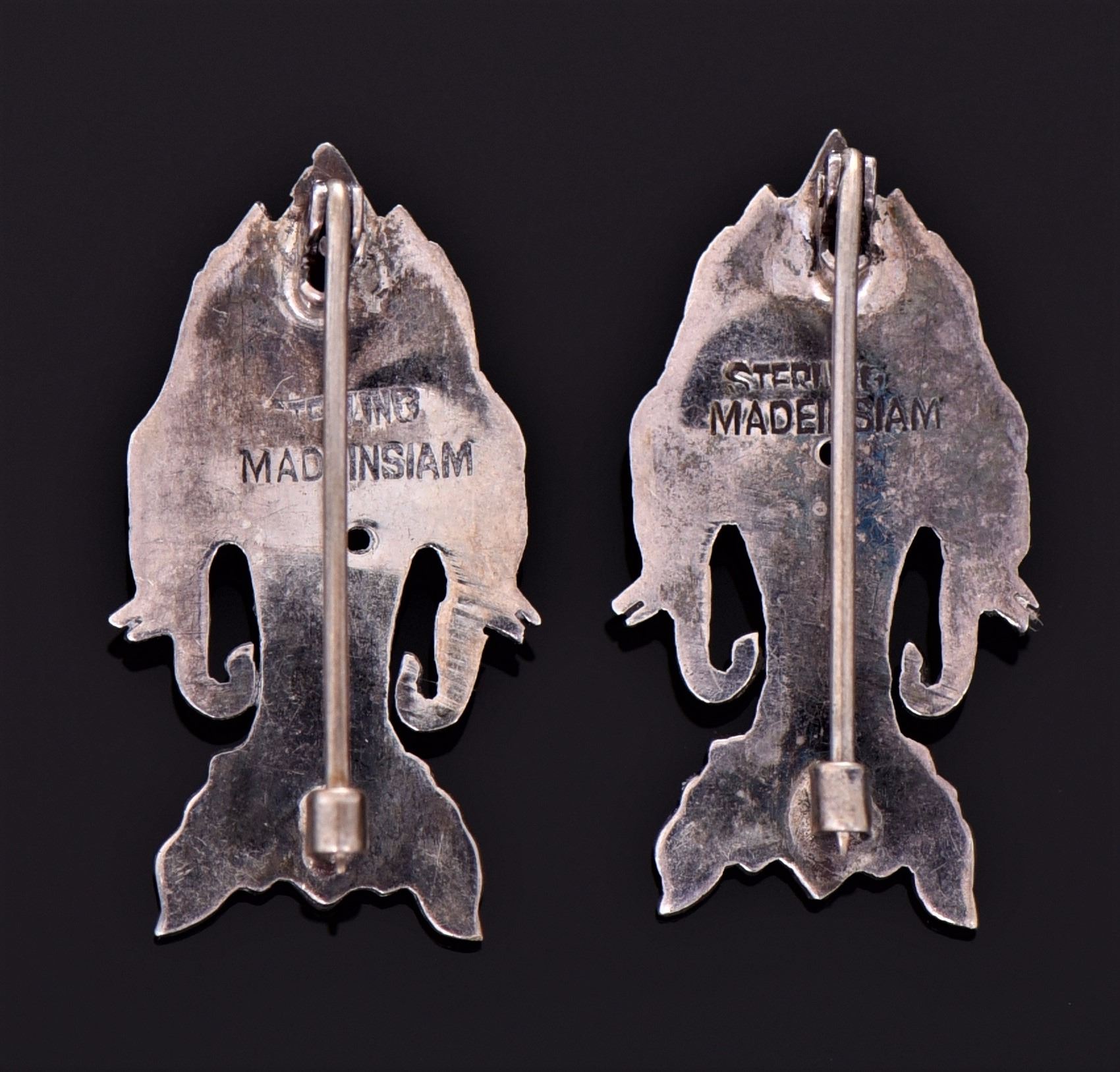 Two Siam Sterling Silver Elephant Brooches. Silver Tested. Estimated more than 50 yrs. old. Traditional Thai art is primarily composed of Buddhist art and scenes from the Indian epics. Traditional Thai sculpture almost exclusively depicts images of the Buddha. Traditional Thai paintings usually consist of book illustrations, and painted ornamentation of buildings such as palaces and temples. Traditional Thai paintings showed subjects in two dimensions without perspective. The size of each element in the picture reflected its degree of importance. Size and/or Weight: See Measurement Photo. (Photos Represent The Lot Condition, Pangaea Auctions)