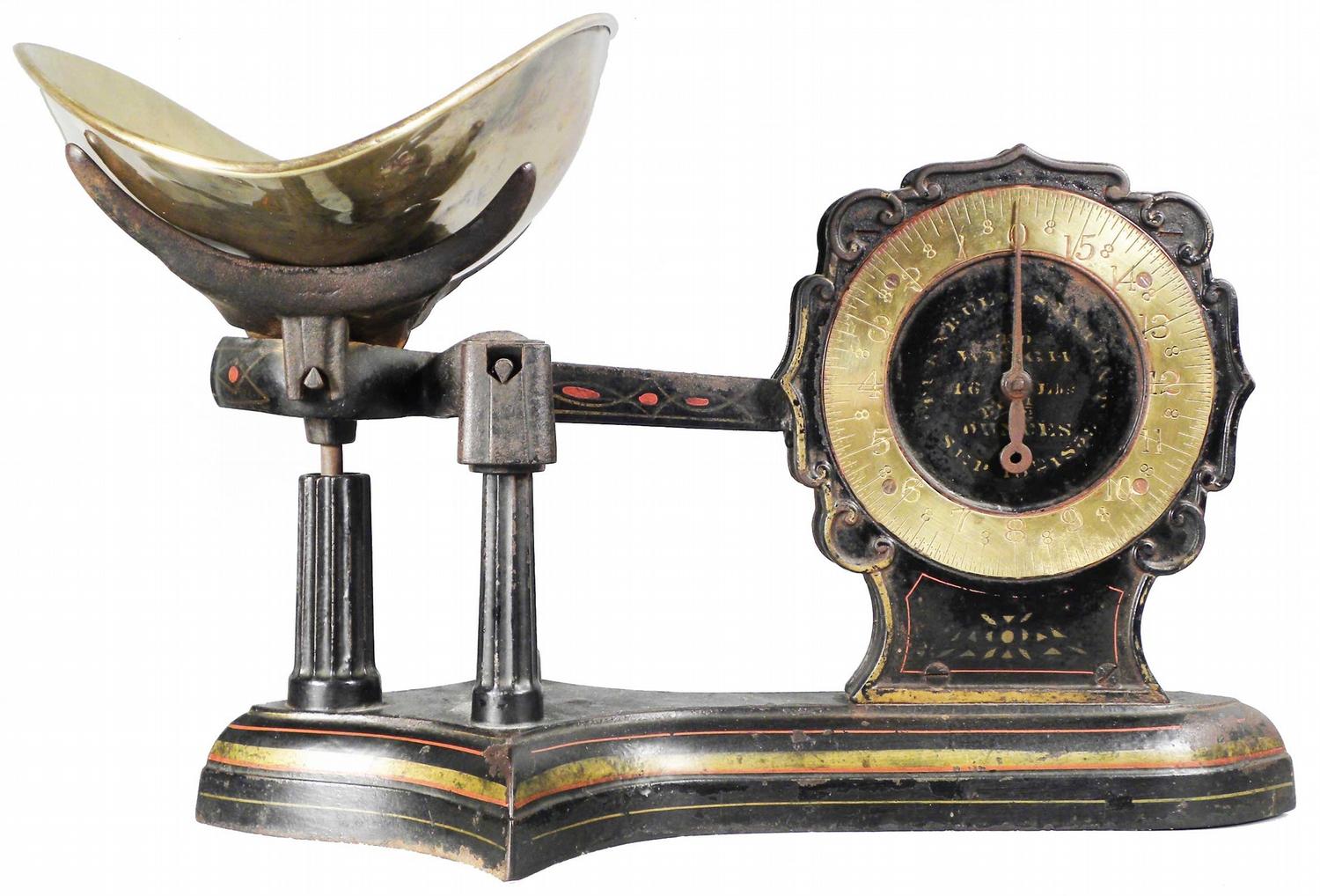 Two Sided Cast Iron Scale. Patented Sept 5, 1850. Brass pan and dial. Good original condition. 18 X 9 1/2 X 8 inches not including pan.