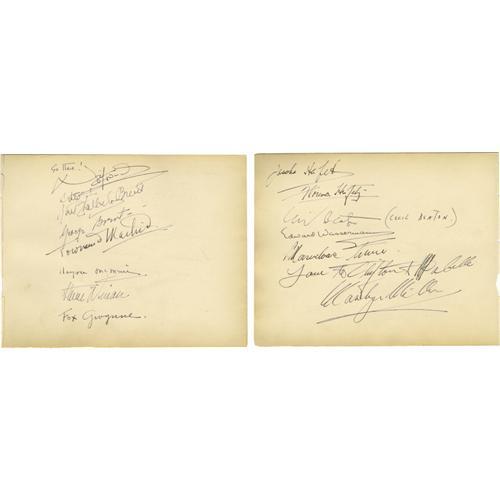 <B>Two Signed Pages from Clifton Webb's Guest Book, Including SIgnatures of Noel Coward and Ruth Chatterton.</B></I> Actor Clifton Webb and his mother Maybelle attracted the most glamorous and accomplished guests to their home, and always requested they sign their guest book. This venerable two-page lot features (on page one) the flamboyant signature of the legendary Noel Coward, as well as Hollywood's early 1930s powerhouse actress Ruth Chatterton (remember her in <I>Dodsworth</B></I>?) - then married to Warner Bros. leading man George Brent (remember him in <I>Dark Victory</B></I>?). In fact, Ms. Chatterton has signed "Ruth Chatterton Brent." George has signed too. Ruth Chatterton signed this way only briefly - having married Brent in 1932, they divorced in 1934. The second page includes the signatures of famed violinist Jascha Heifetz, designer Cecil Beaton (later of <I>My Fair Lady</B></I> fame), and the beautiful Ziegfeld star Marilyn Miller. A superb lot! Excellent condition. <I>Accompanied by LOA from PSA/DNA.</B></I><BR><BR><b>Shipping:</b> Flat Material, Small (<a target="_blank" href="http://www.heritageauctions.com/common/shipping.php">view shipping information</a>)
