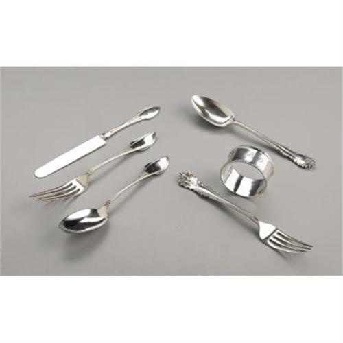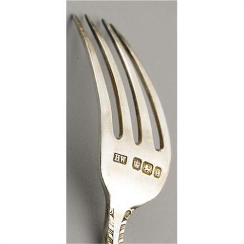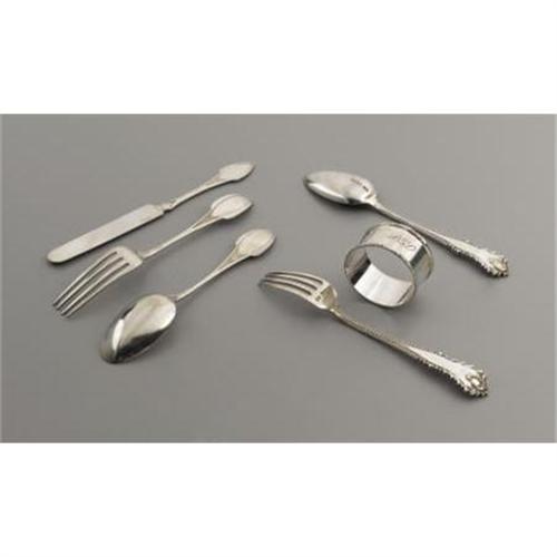 <B>An English Silver Christening Set</B></I><BR><BR>Lee & Wigfull, Sheffield, England<BR>1900-01<BR>Silver<BR>Marks: (crown), (lion passant), <I>HW, h</B></I><BR>4.55 troy ounces total<BR><BR>Comprising a fork, spoon and napkin ring in original fitted box. Together with another set made by Wood & Hughes, New York, circa 1871-77 comprising a fork, spreader and spoon monogrammed <I>EMH 1877</B></I> in original fitted box marked <I>Wm P. DeNehey, Harrisburg, PA</B></I><BR><BR><b>Shipping:</b> Requires 3rd Party Shipping (<a target="_blank" href="http://www.heritageauctions.com/common/shipping.php">view shipping information</a>)
