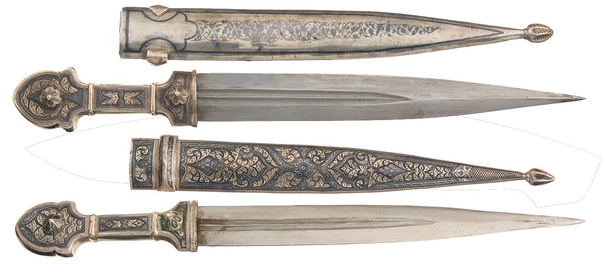 Both daggers in this lot are in the Caucasian style, and outfitted with German silver grips and sheaths that were then silver inlaid. 1) Caucasian dagger, 10 1/4" double edged double fuller blade with red filler material in the grip, with is fitted with a pair of round spike ornaments on one side, and engraved and inlaid in scroll and punch dot patterns on the front and inlaid in leafy vine designs on the rear. OAL: 15". The sheath has similar decoration, with checkerboard patterns on and near the tip. 2) Caucasian dagger, 10 5/8" blade, double fuller on one side and single on the other. OAL: 15 1/4". Hilt and sheath decorated as 1, with a flower on the center of the sheath.