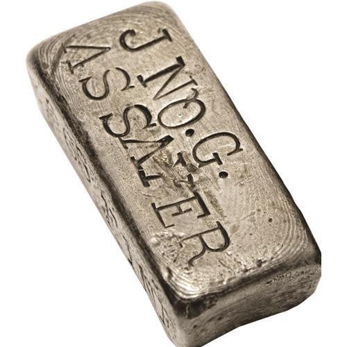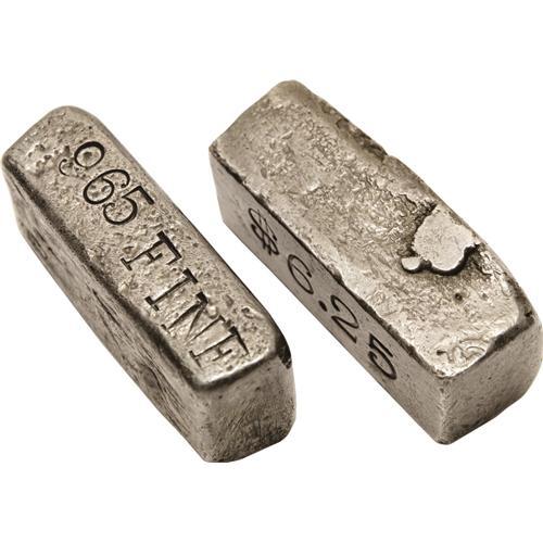 <B>Two Silver Ingots.</B></I> One piece is very crude, a 965 fine bar with no assayer info. The other is crudely stamped Jno. G. Assayer, an abbreviation for "John G."<BR> These two crude ingots have several problems, such as lacking the assayer identification, and the other with an assayer's name punched on the apparent wrong side of the ingot. There are no assay chips, and no fineness noted. These ingots could have no specific purpose, such as an exhibition, presentation, or mine ingot, because they are improperly marked. But this does not preclude them as private keepsakes.<BR> There are only two John G. assayers on a privately prepared western assayer list from 1852-1900. These are John Goldsworthy, Los Angeles, 1880-1887, who would have perhaps assayed Darwin or Cerro Gordo ores; and John Griswold, San Francisco, 1880-1883, who would have perhaps assayed Nevada or Napa silver ores.<BR><I>From The Kagin Reference Collection of Frontier Ingots.</B></I>