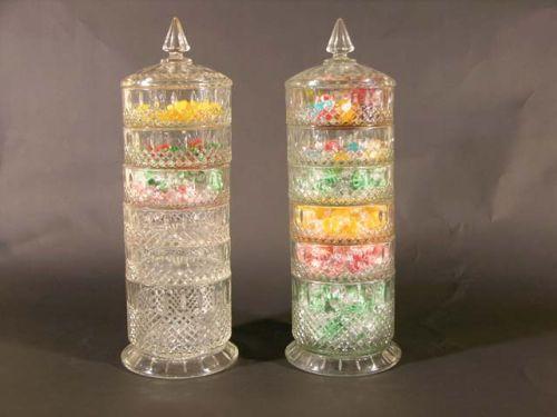 Two six-section candy bowls with original lids, pressed glass, ex. cond.