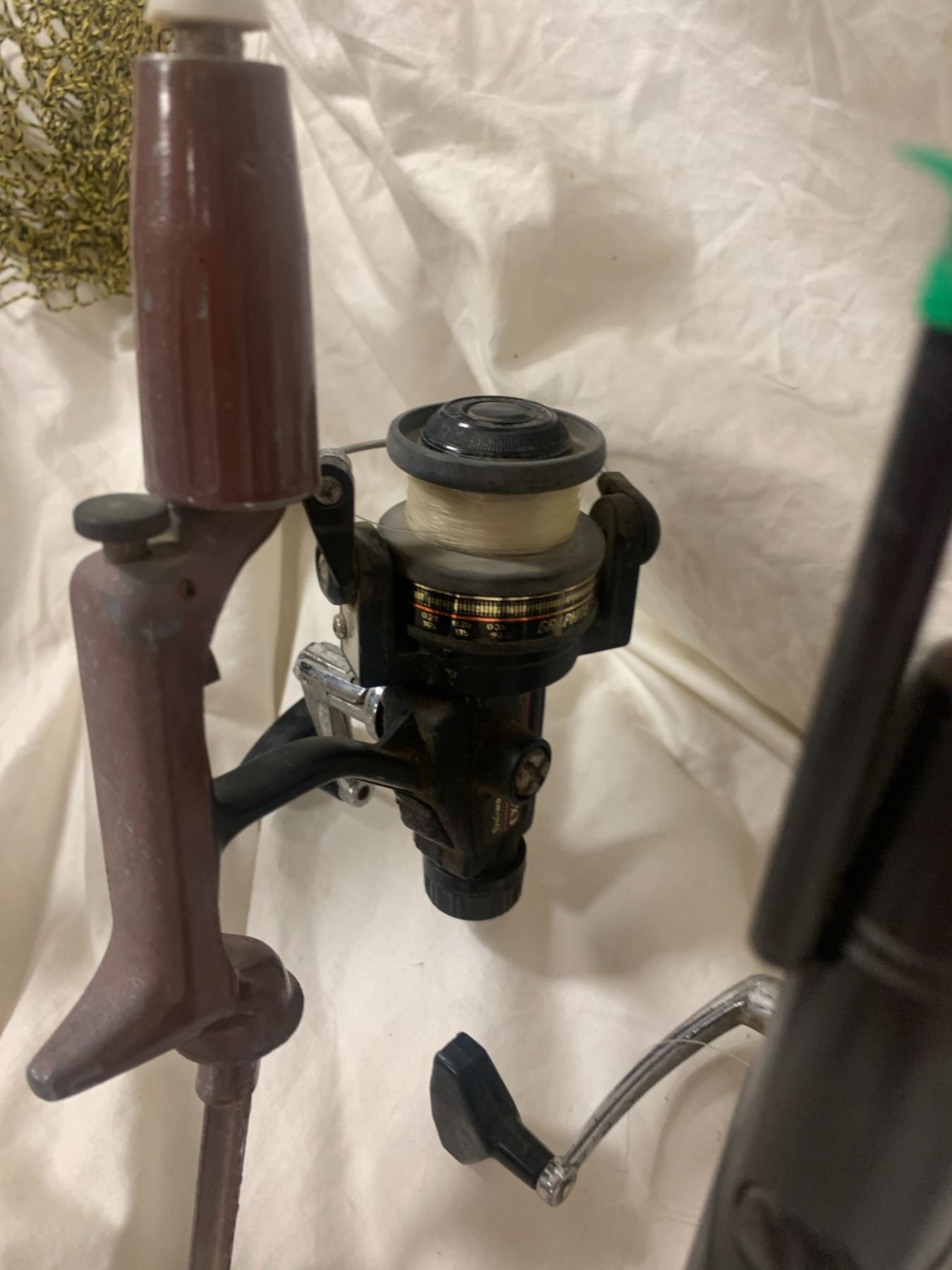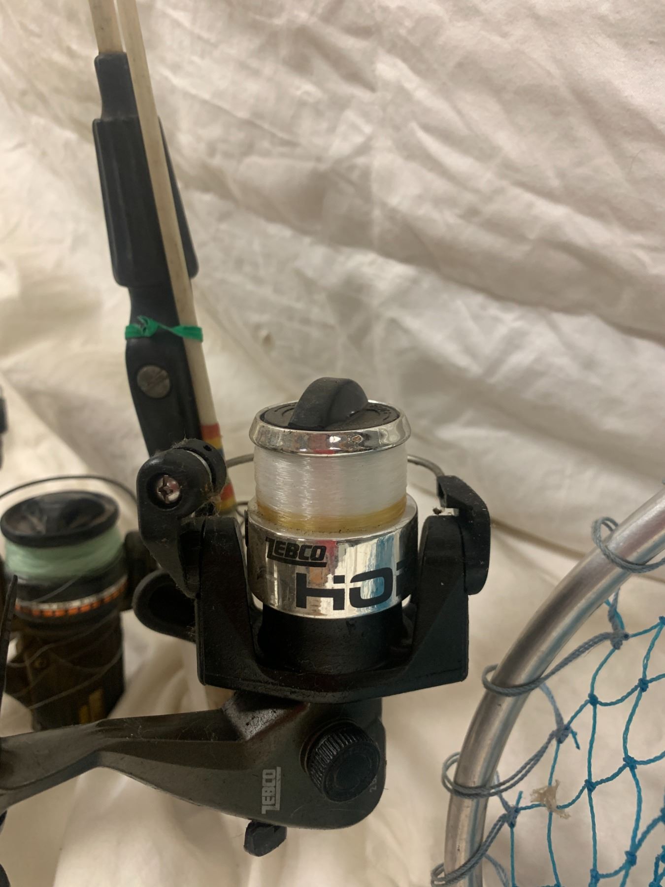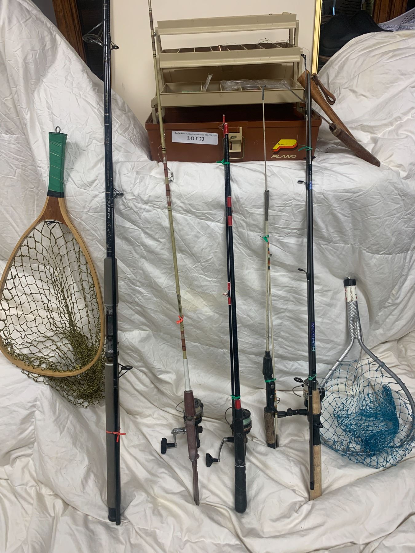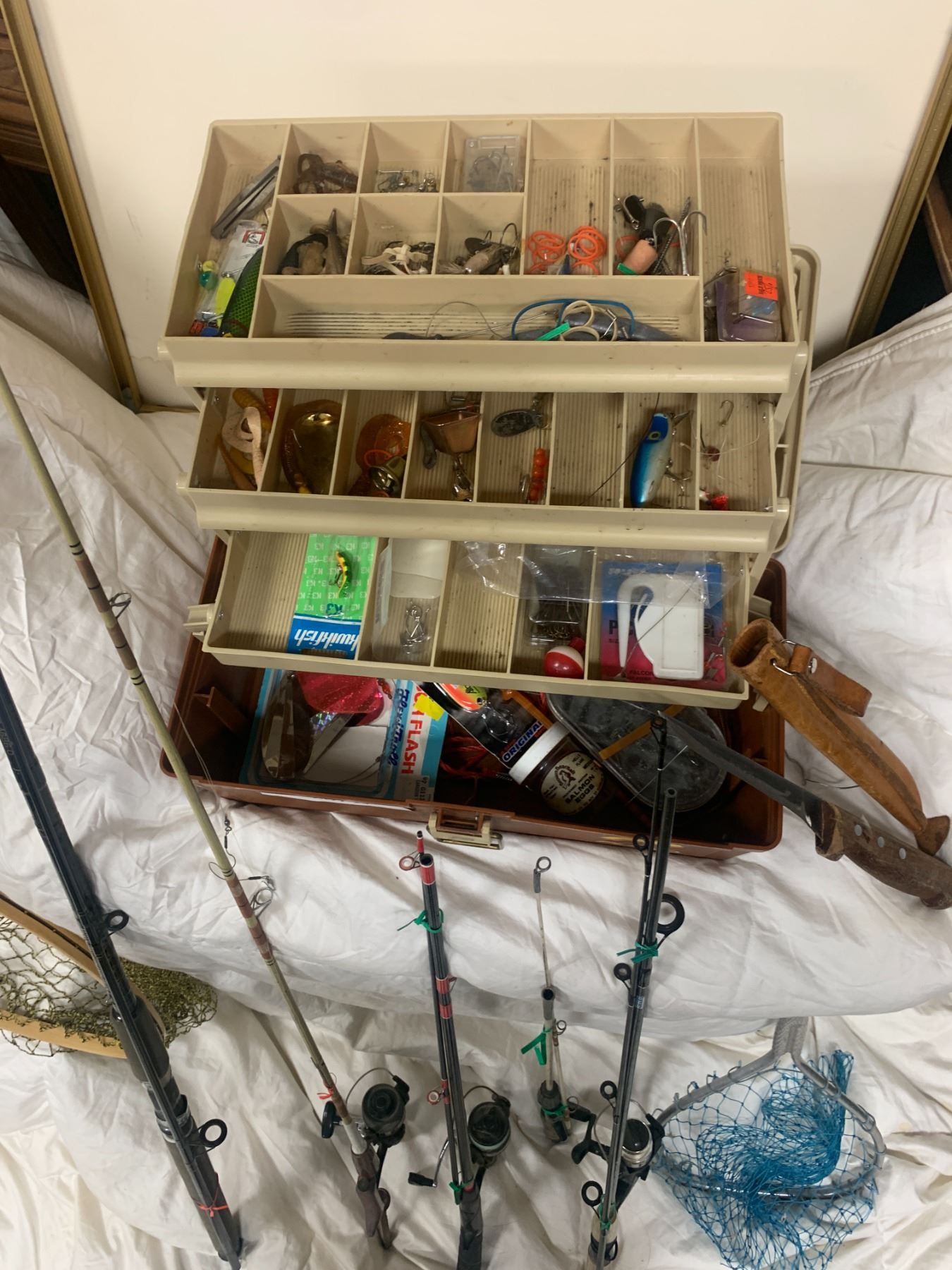 Two Small Hand Nets, Asst Fishing Rods, Filet Knife, Tackle Box w Asst Fishing Gear
