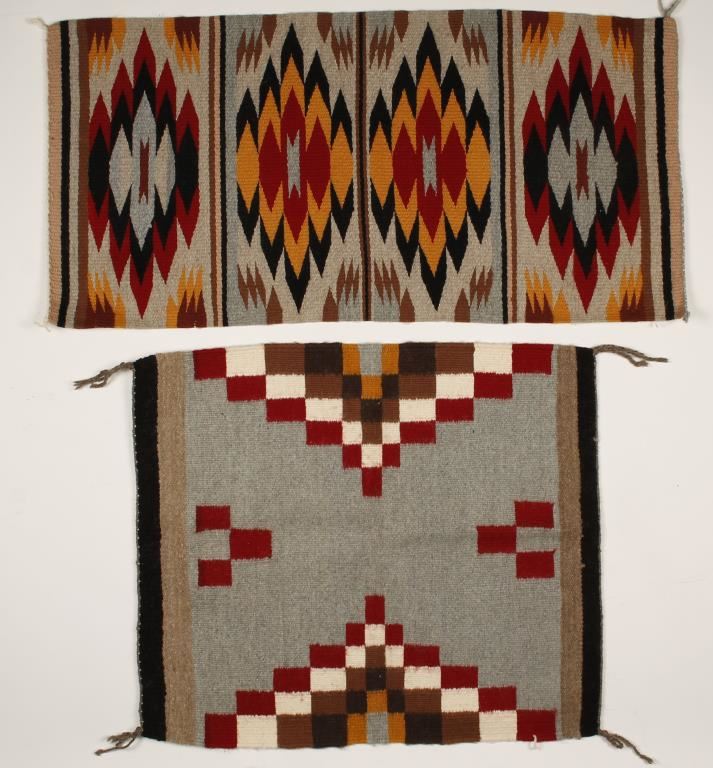 Hand woven wool saddle blanket with grey, yellow, red black, and brown material. Measures 39" x 13" in very good condition and a hand woven wool square textile with red, white, brown, black, yellow, and grey material 25" x 28" in good condition with some color bleeding.