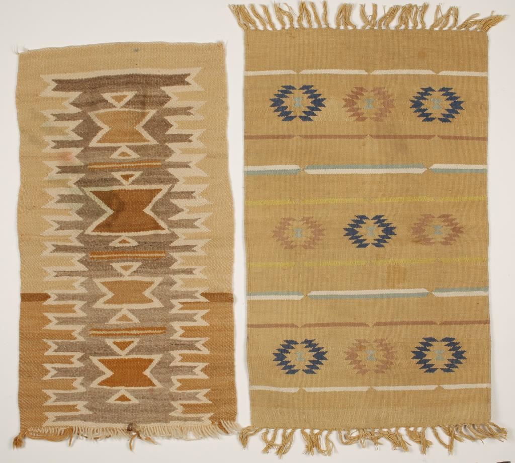 (1) Tightly woven rug with fringe made of white, tan, blue turquoise, and yellow material. Measures 20" x 33" and is in good condition. (1) Hand woven wool textile made with brown, beige, white and gray material. Measures 31" x 17" and is is fair condition with water damage and wax like substance on a small area.