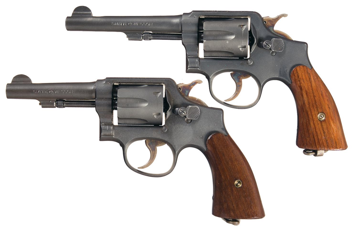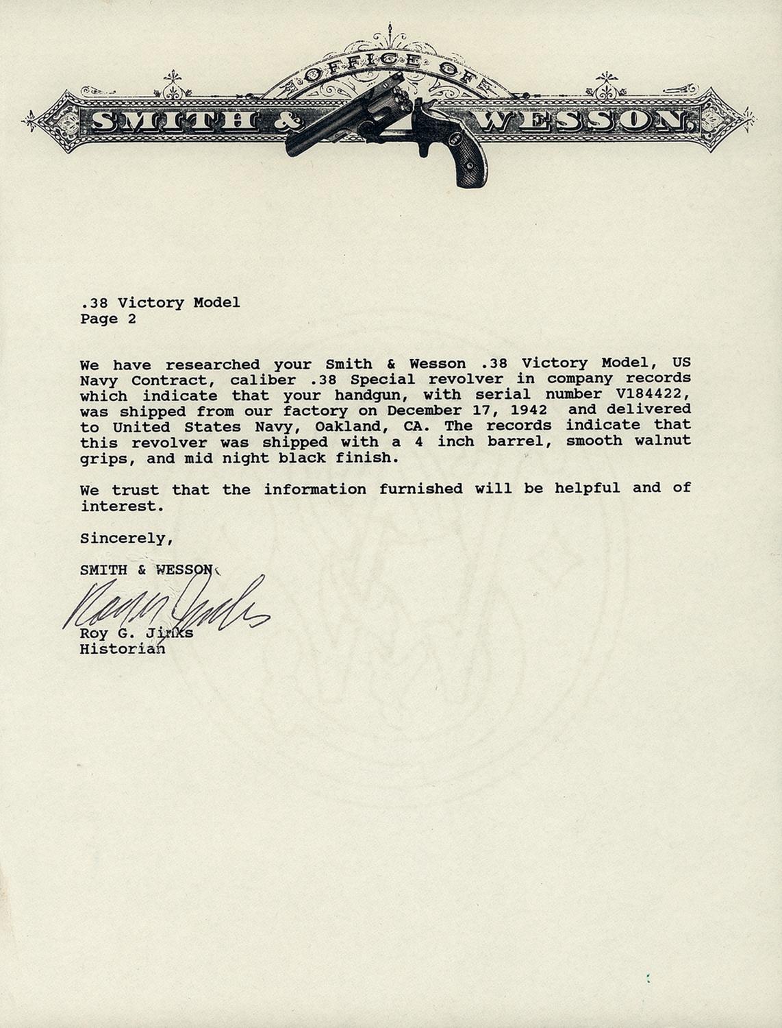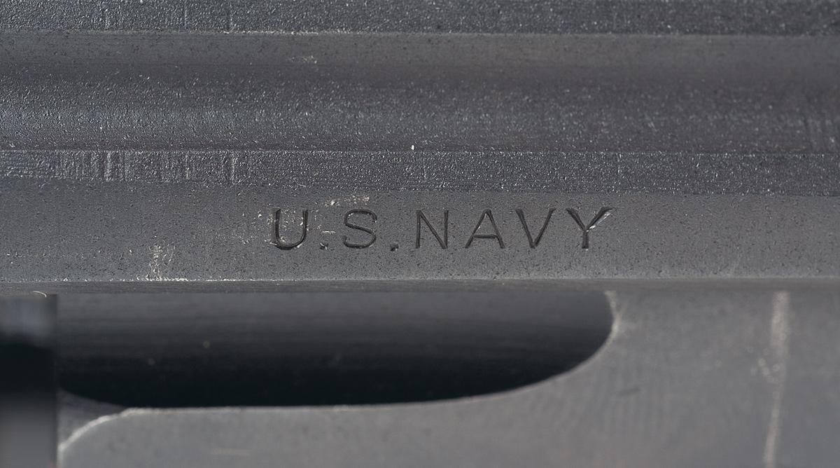 Manufactured between 1942 and 1945 featuring a forged round blade front sight with a square notch rear, casehardened trigger and hammer with smooth oil finished walnut grips. The left side of the top strap is marked "U.S. NAVY" with the top of the barrel marked with the two line address/patent dates, "SMITH & WESSON" on the left, caliber designation on the right, "MADE IN U.S.A." on the right front of the frame and the S&W logo on the rear. Matching serial number on the rear cylinder face and butt. The accompanying factory letter verifies this serial number as shipped to the U.S. Navy, Oakland, Ca with 4" barrel, smooth walnut grips and mid night black finish on December 17, 1942.