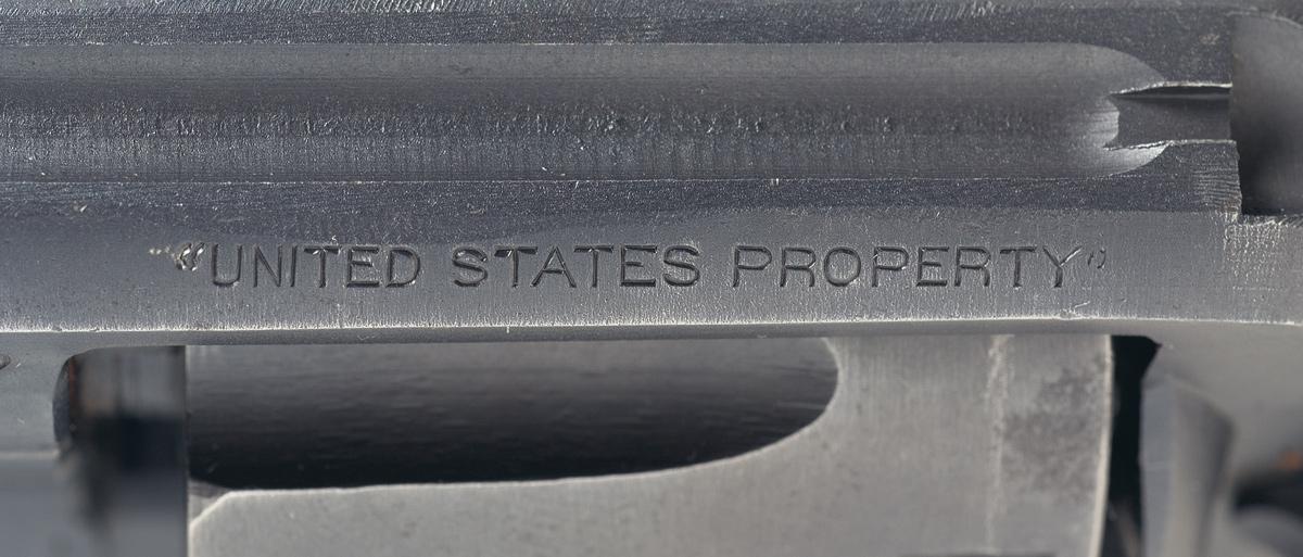 A) This is an exceptional example of a Model of 1905 4th Change manufactured from 1915 to 1940. The top of the barrel is marked with the two line address/patent dates, the right side "38 S&W CTG." and the left side "SMITH & WESSON". The left side of the top strap is marked "UNITED STATES PROPERTY". The butt ahead of the lanyard ring is marked with a boxed "WB" and ordnance bomb and "P", and the serial number is behind the swivel. Parkerized finish with casehardened hammer and trigger, and fitted with smooth walnut grips with the right panel numbered to the gun.