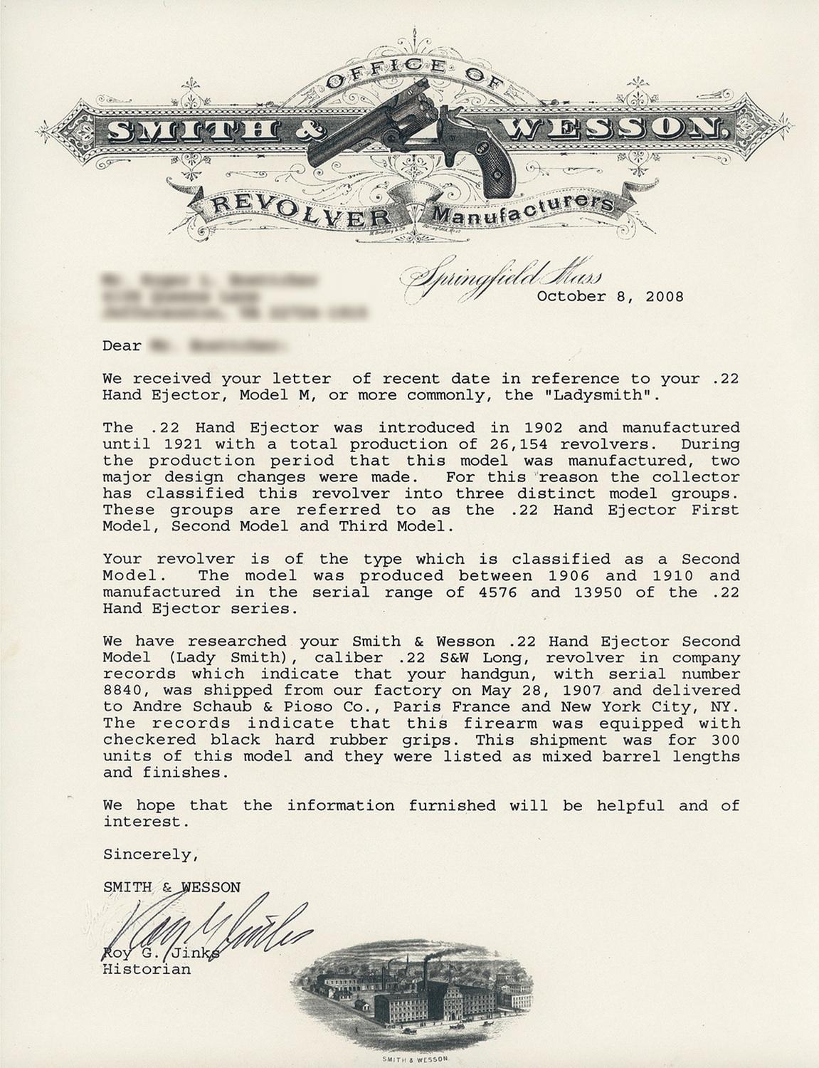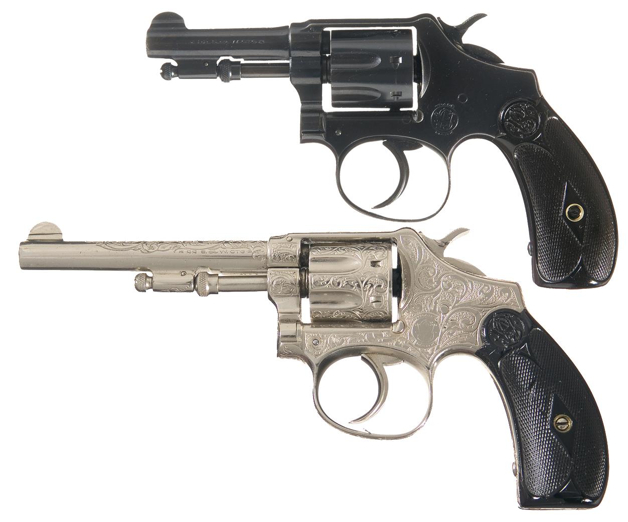 A) Manufactured in 1907 features fixed sights, a checkered hammer, a smooth trigger, a fluted seven round cylinder, and black checkered grips with S&W logos. Caliber designation on the left side with the 2nd model barrel address/patent dates on the right side. S&W logo on the left side of the frame. Fitted with checkered hard rubber grips with the S&W logo embossed on the top of each panel. Complete with factory letter that states the revolver was shipped 28 May 1907 to Andre Schaub & Pioso Co., Paris France and New York City, NY with 300 units of various barrel length and finishes.