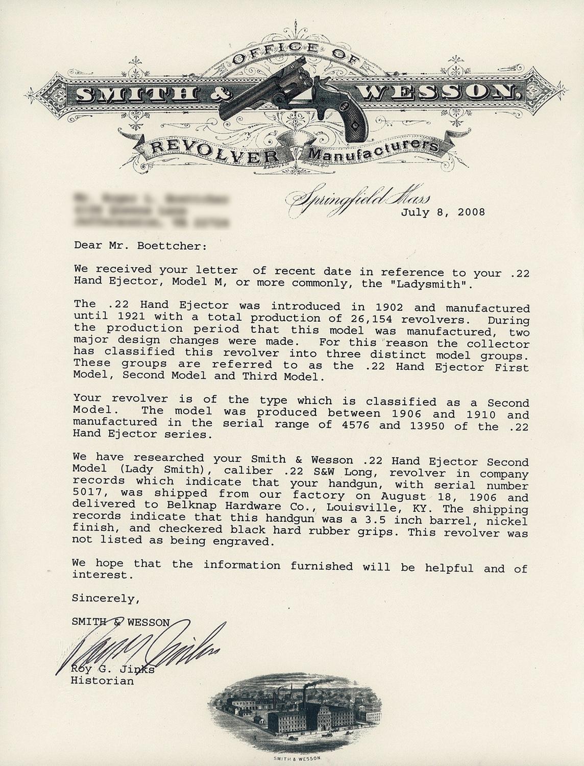 Manufactured in 1906 and features blade front and notch rear sights, standard two line address/patent dates marked on top of the barrel, "22 S&W CTG." flanked by Maltese crosses on the left side and the S&W logo on the left side of the frame. Nickel finish overall with a floral scroll engraving with punch dot background that covers 90% of the revolver. Complete with factory letter that states the revolver was shipped to Belknap Hardware Co., Louisville, KY on the 18th of August 1906 and confirms the 3 1/2" barrel length and hard rubber grips.