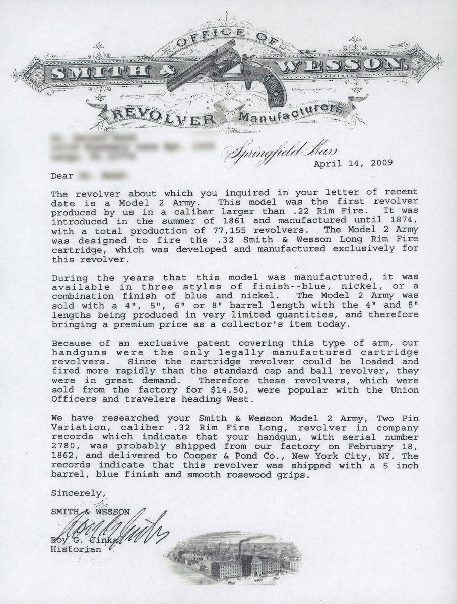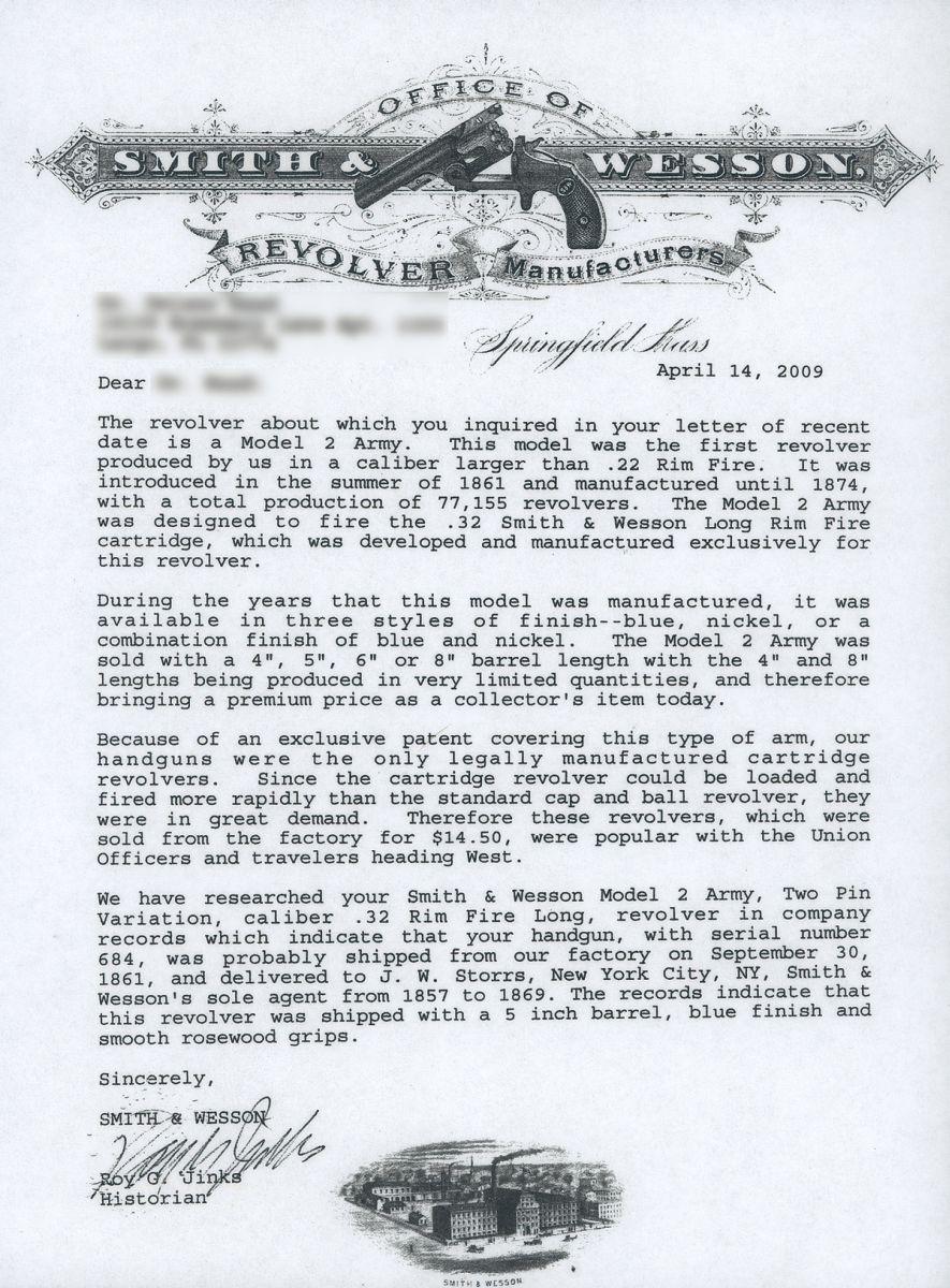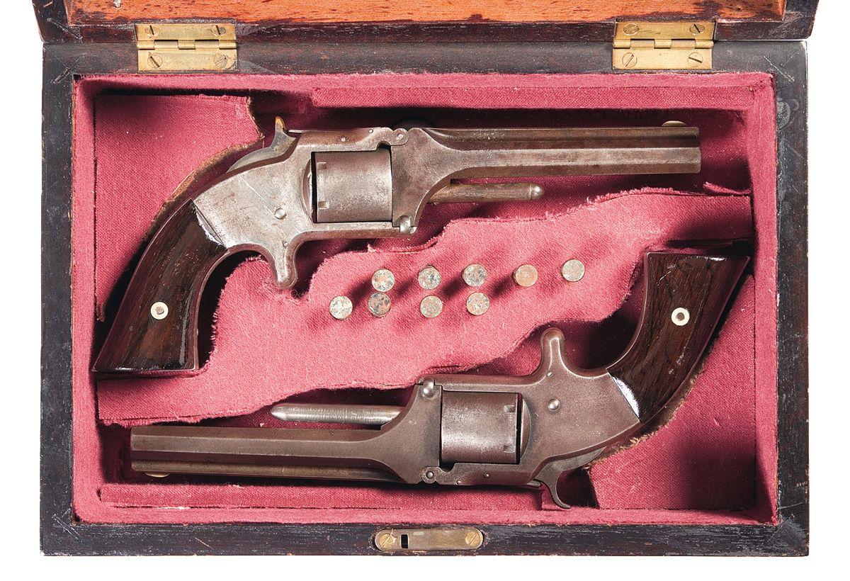 B) As A, with repaired hammer spur. In case with A, not attributed to the same soldier. The accompanying factory letter verifies the variation, serial number, barrel length, finish, grips and that it was shipped to J.W. Storrs, N.Y., N.Y. on September 30, 1861, S&Ws sole agent from 1857 to 1869.