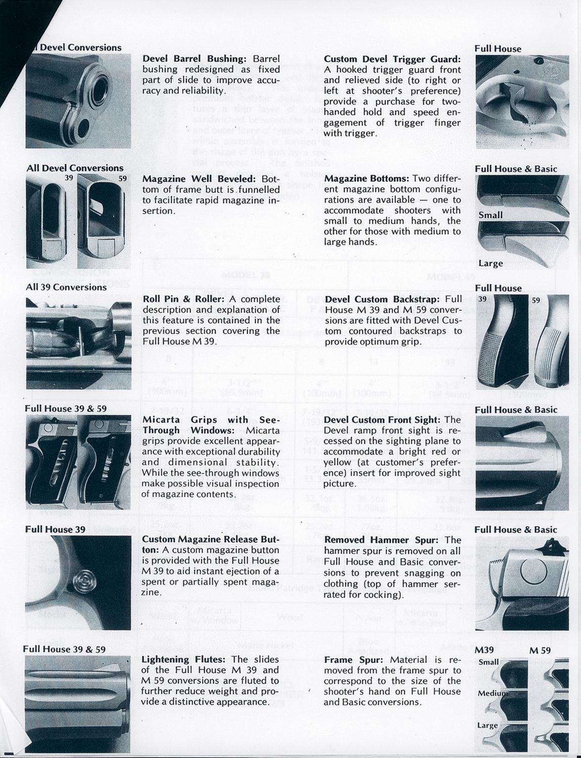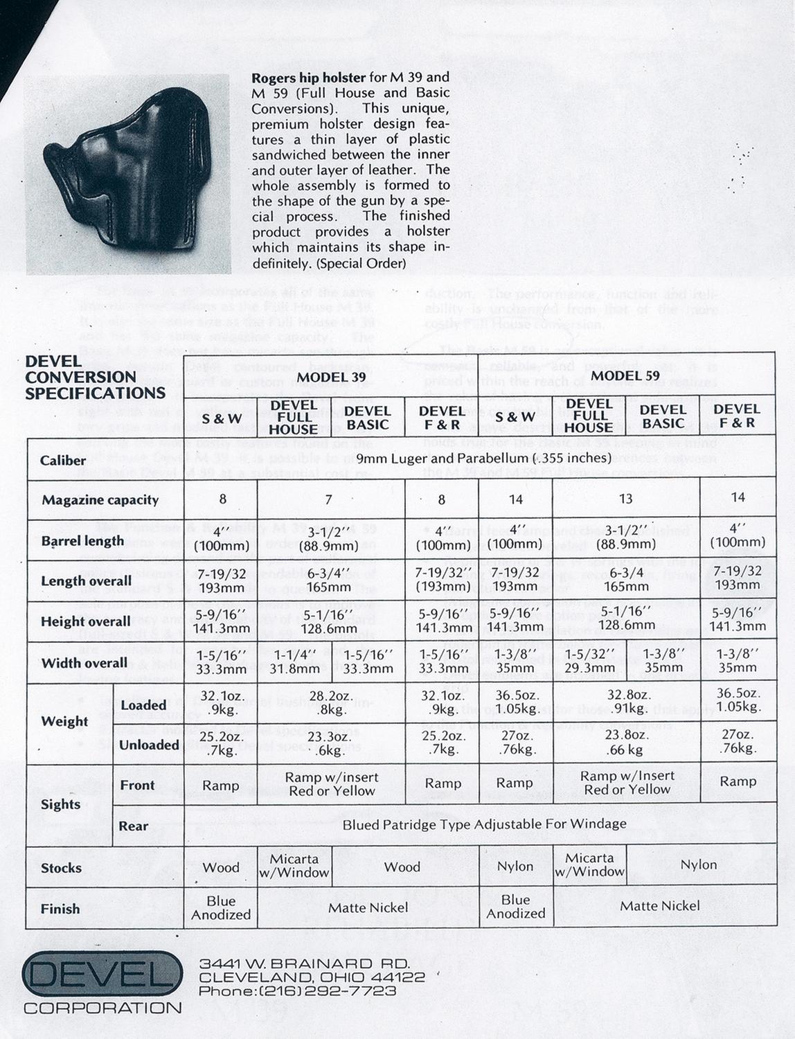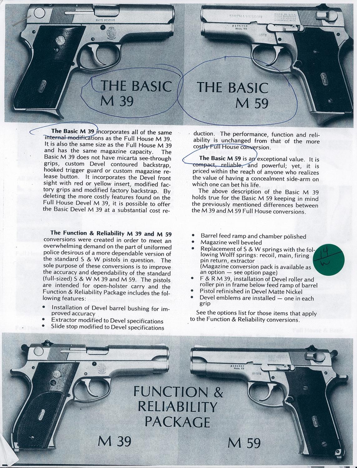 A) Manufactured from 1971 to 1982, this particular pistol has the Devel conversion (also know as the "function and reliability package"), which consists of the shorter 3 1/2" barrel (rather than 4"), Devel front sight with recessed ramp, with red insert, 13 round magazine (usual 14 round), rear Patridge type rear sight adjustable for windage and the matte nickel finish. Mechanically the pistols extractor and slide are modified to Devel specifications. A Devel barrel bushing is installed to improve accuracy. The feed ramp and chamber are polished. The magazine well beveled and the recoil, main, firing pin and extractor springs are replaced with wolff springs. The pistol has the standard markings with the addition of "PAT'S PENDING" on the right side of the slide below and behind the ejection port. Fitted with black checkered grips with the "S&W" logo at the top and the "DEVEL" emblems in the middle. Complete with three extra (four total) double stack magazines.