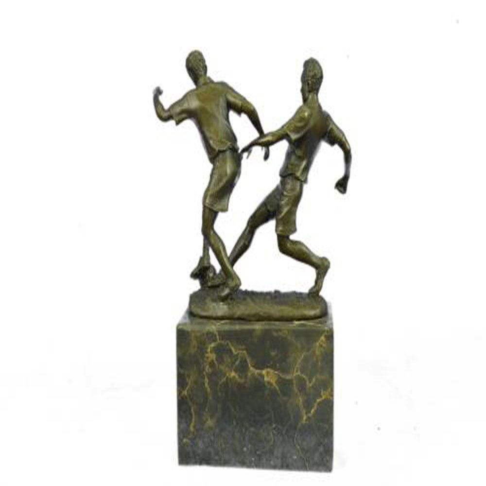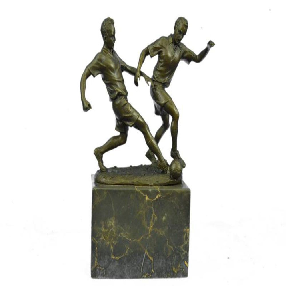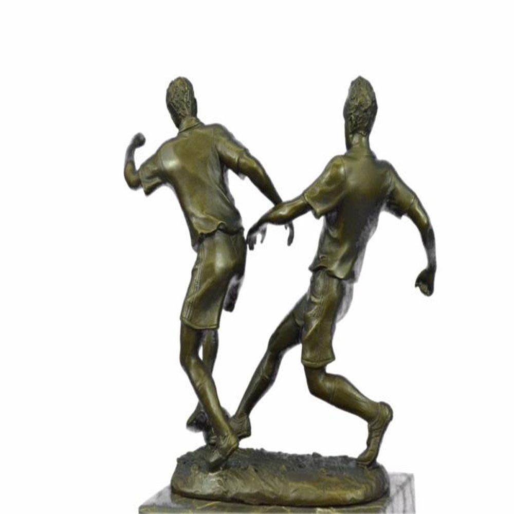 They are legend on the field. Two soccer players tumbles down the grassy field, kicking, and dodging along the way. They are swift on their feet. One nears the goalpost and lunges one leg forward, propelling the ball towards the net. He wears a typical soccer uniform, a jersey, shorts, high socks and sneakers. The details are in the ripples of his moving clothes. This would make a great gift for the soccer football lover in your life. This brown patina Sculpture was cast using the Lost Wax Method and mounted on a marble base. Bronze Dimensions with Marble Base: Height 9 X Width 8 inches. Weight: 8 LBS.