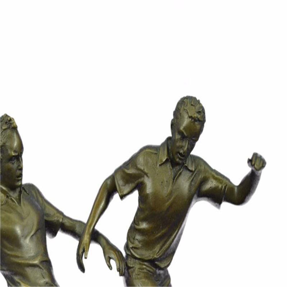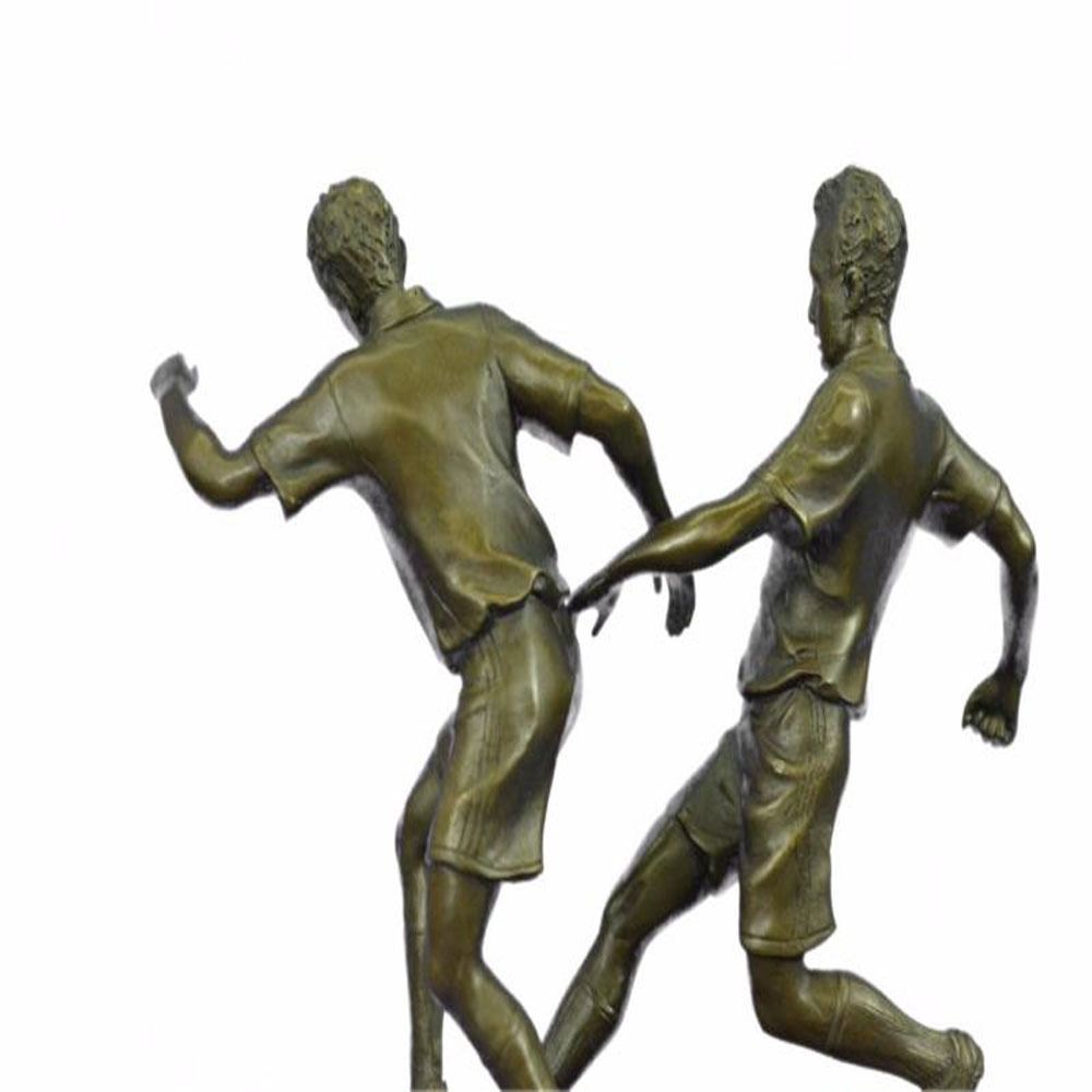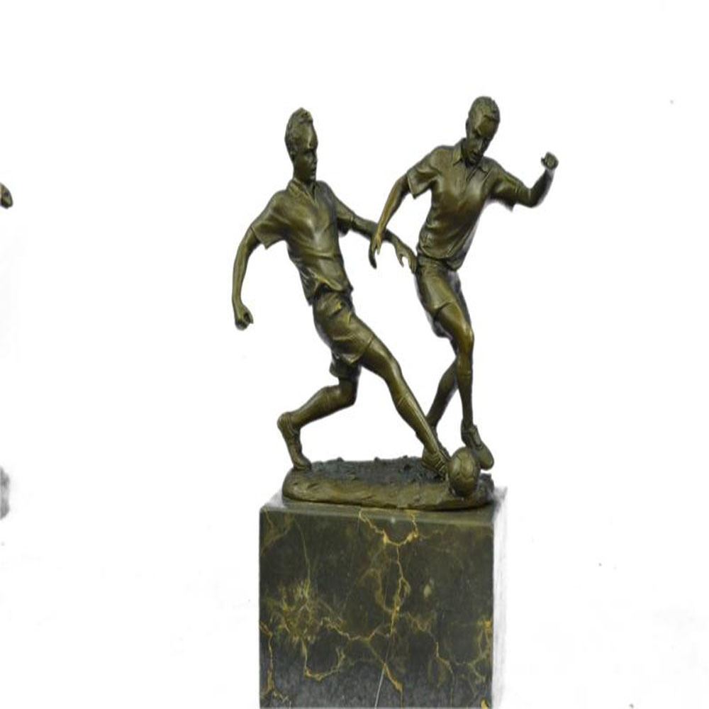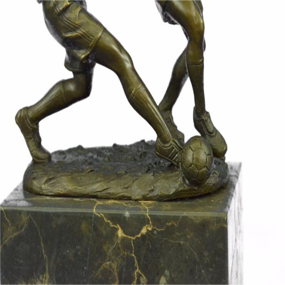 They are legend on the field. Two soccer players tumbles down the grassy field, kicking, and dodging along the way. They are swift on their feet. One nears the goalpost and lunges one leg forward, propelling the ball towards the net. He wears a typical soccer uniform, a jersey, shorts, high socks and sneakers. The details are in the ripples of his moving clothes. This would make a great gift for the soccer football lover in your life. This brown patina Sculpture was cast using the Lost Wax Method and mounted on a marble base. Bronze Dimensions with Marble Base: Height 9 X Width 8 inches. Weight: 8 LBS.