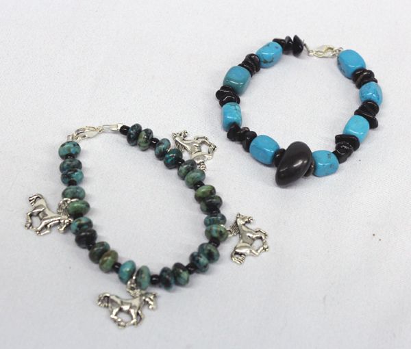 Two Southwestern Bracelets of Turquoise & Beads. 1) 6'' long with turquoise and glass seed beads. Largest stone is .75''. 2) is turquoise, glass seed beads and 4 Tibetan silver horse charms. 6'' long, both strung on wire with sterling clasps.