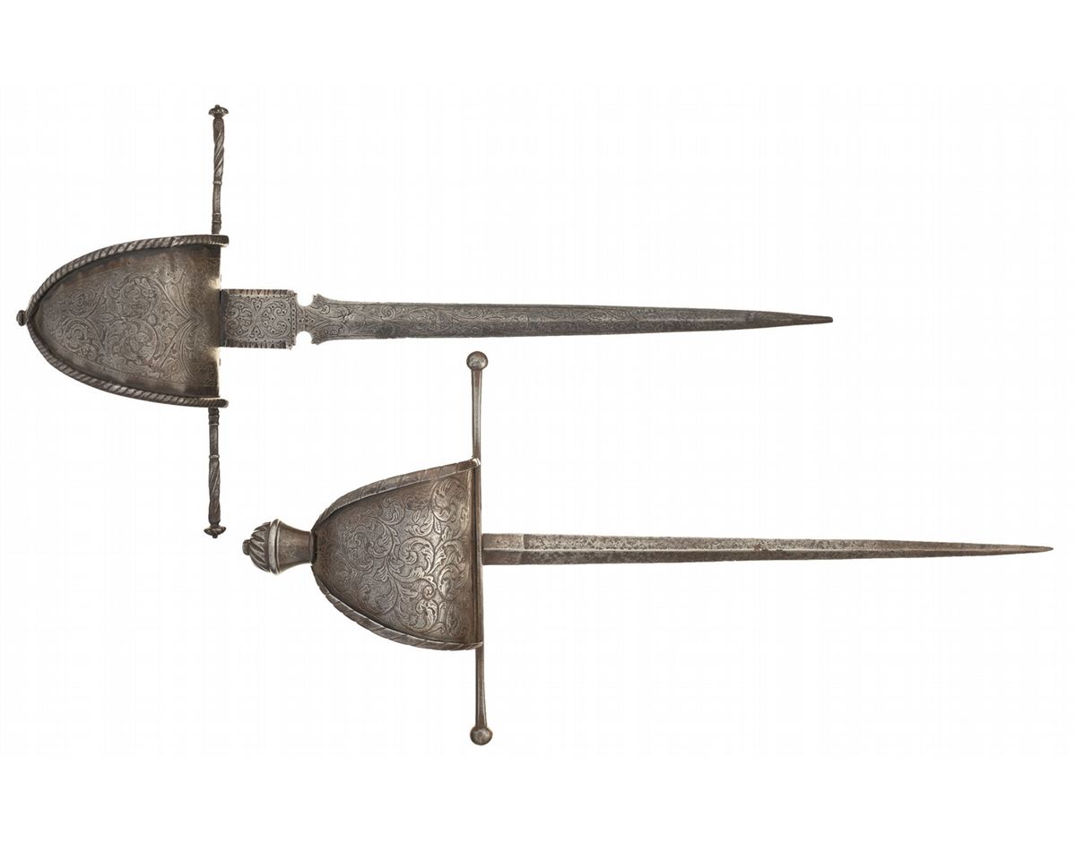 1) Measuring 20 1/2 inches overall, with a 15 1/4 inch 18th Century blade, diamond cross-section with chiseled engraving, a pair of blade-catching notches above the ricasso and a dished thumbrest. Twisted ball tipped quillons, 10 3/4 inches across, with a triangular guard outfitted with chiseled scroll engraving and rolled rope style edges. With a wire wrapped grip and a fluted ball pommel. 2) Measuring 20 1/2 inches overall, with a 14 1/2 inch blade, diamond cross-section with a flat thumb rest on the ricasso. Straight ball tipped quillons, 18 inches across, with a triangular guard outfitted with chiseled scroll engraving and rolled edged. With a brass wire wrapped grip and a fluted ball pommel. Provenance: The William Ashby Collection