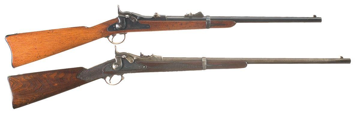 B) Shortened barrel and stock, removed rear sight, added breechblock peep sight, crudely checkered stock with metal plate attached to wrist behind upper tang for a sight mount.