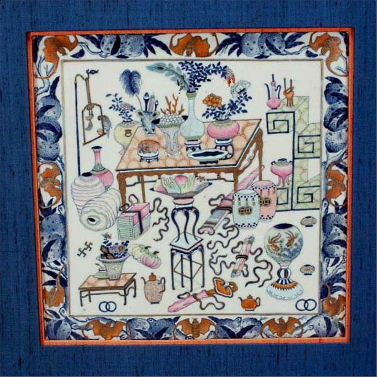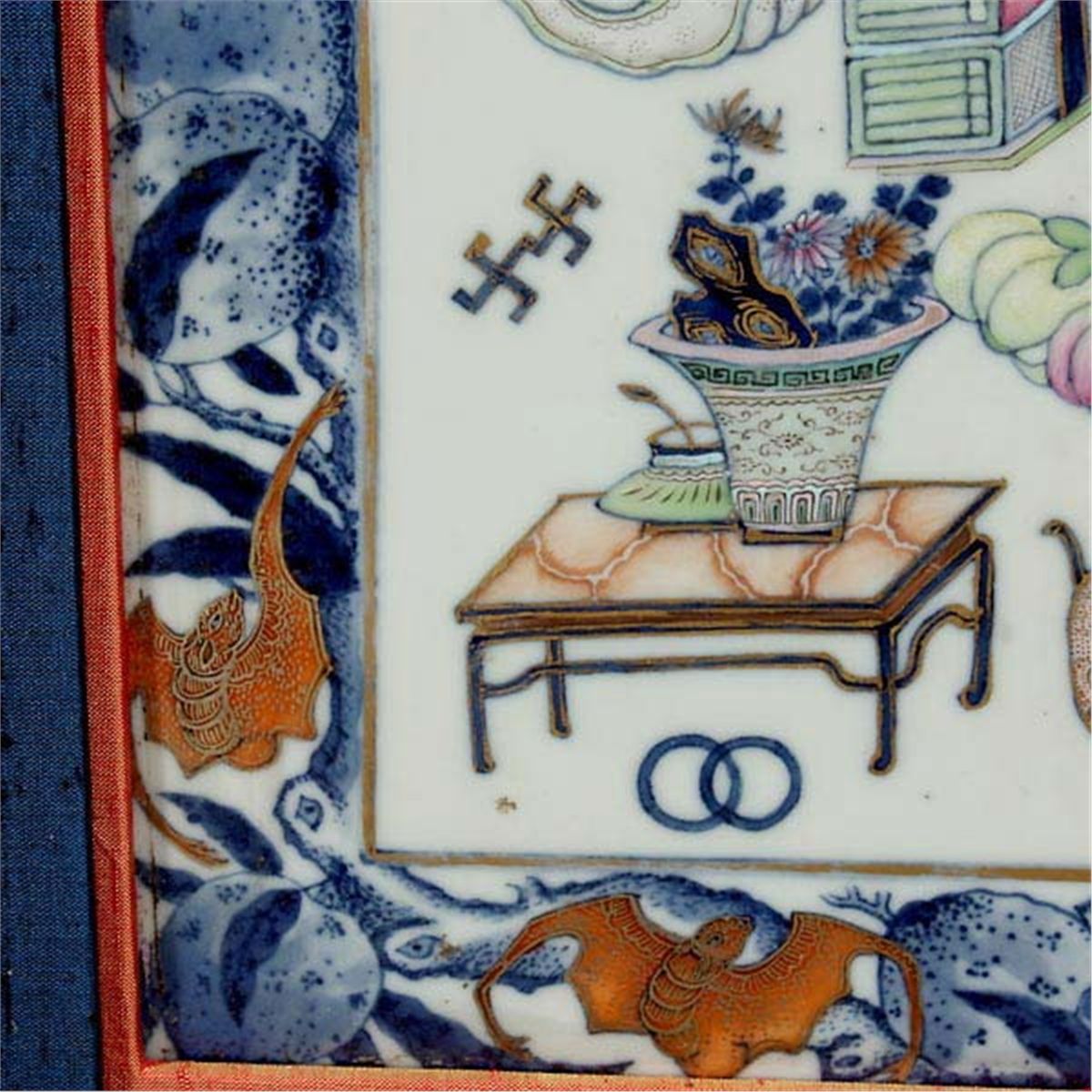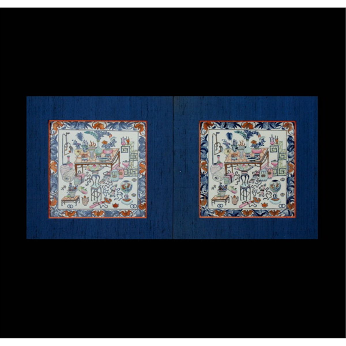 Two Square Porcelain Plaques, Each painted in underglaze blue featuring various antiquities set on furniture within a peach and iron-red bat border, framed. Late Qing Dynasty, Each Plaque: 14 x 14 inches (35.5 x 35.5) approximately Provenance:Acquired from Sotheby's, Hong Kong, November 4, 1974, Lot 350.