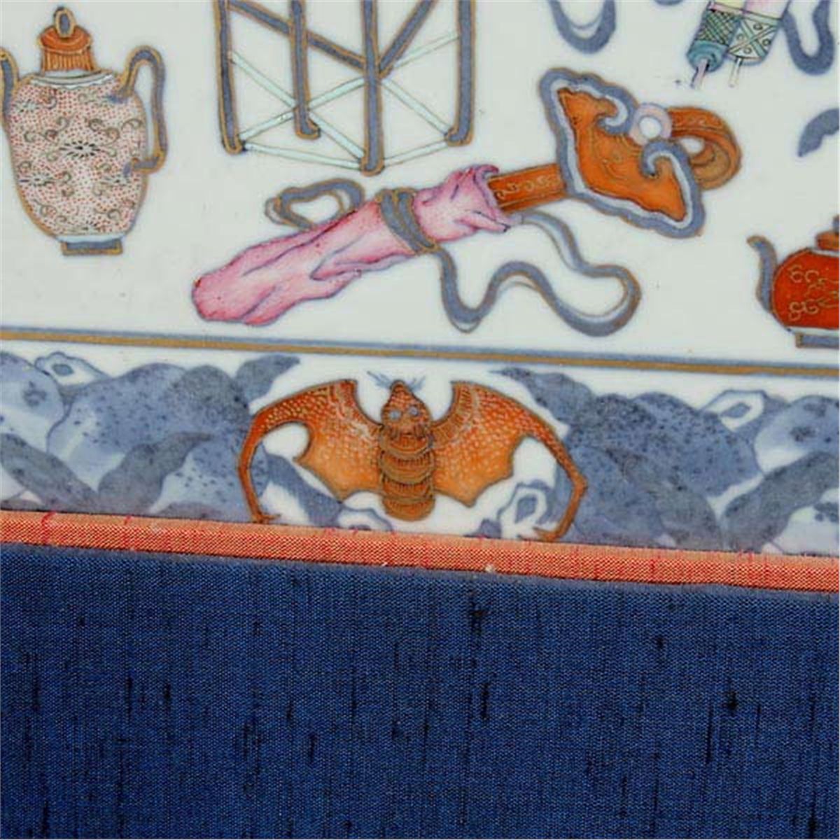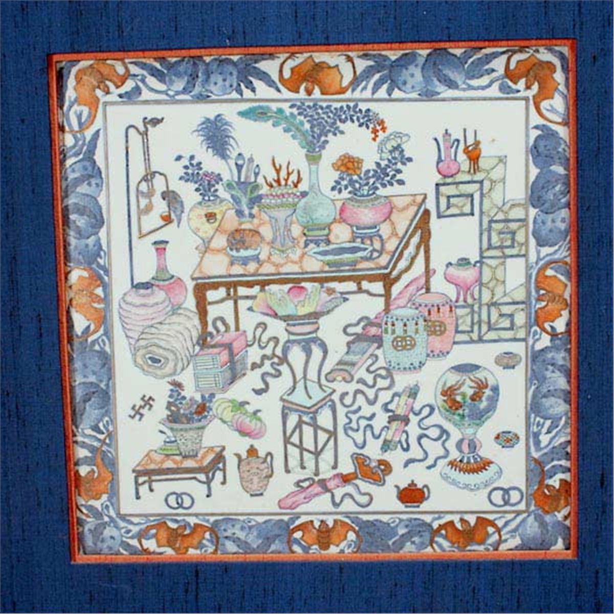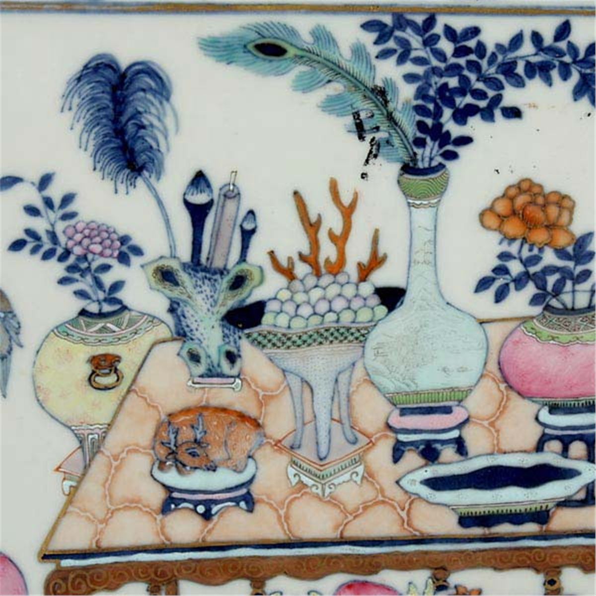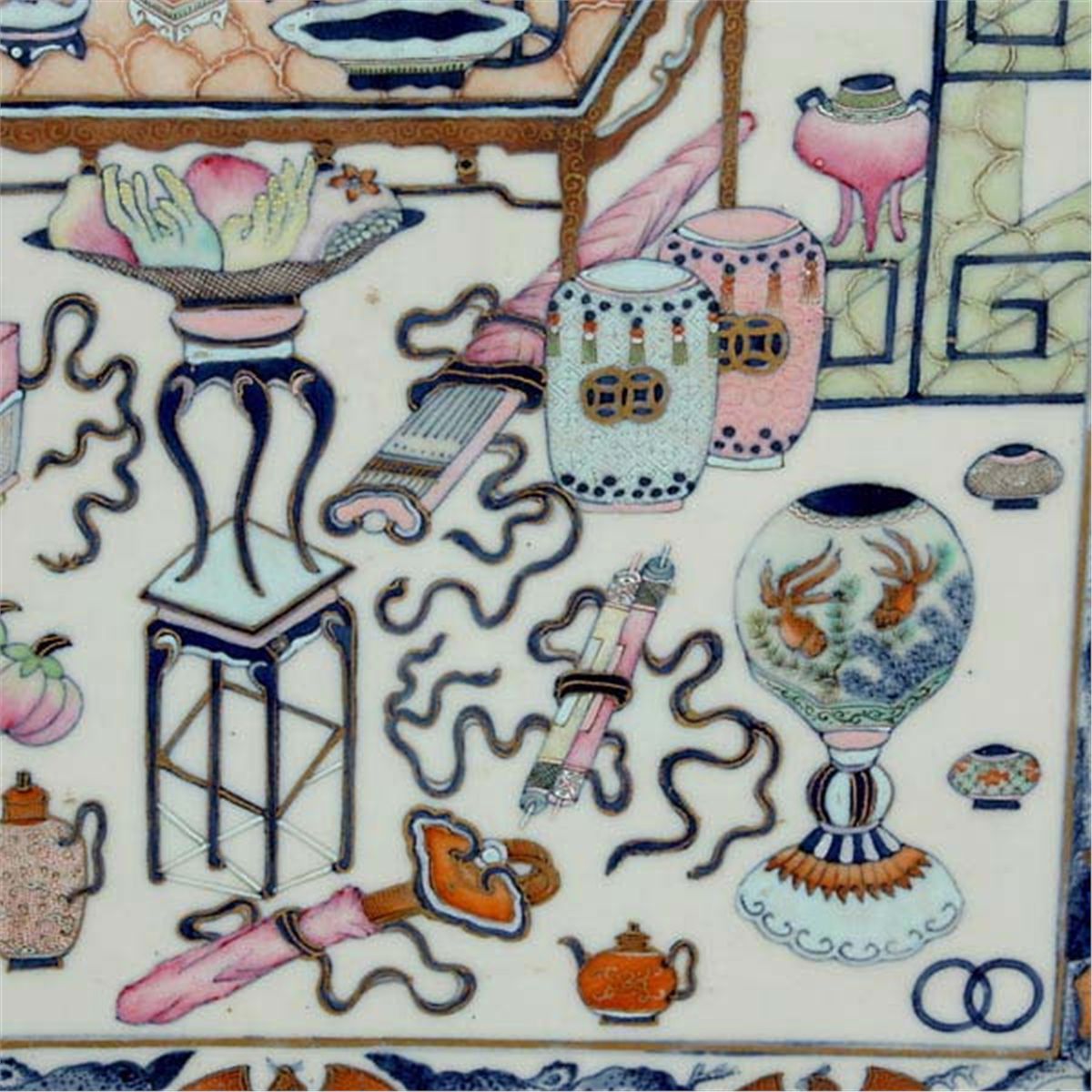 Two Square Porcelain Plaques, Each painted in underglaze blue featuring various antiquities set on furniture within a peach and iron-red bat border, framed. Late Qing Dynasty, Each Plaque: 14 x 14 inches (35.5 x 35.5) approximately Provenance:Acquired from Sotheby's, Hong Kong, November 4, 1974, Lot 350.