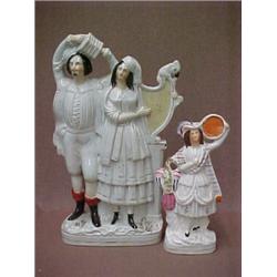 Two Staffordshire figurines including double figurine of standing man with accordian and standing woman with harp, (chip at top of harp), 17"high; and figurine of woman holding tambourine (some cracks) 11" high, both mid 19th C.