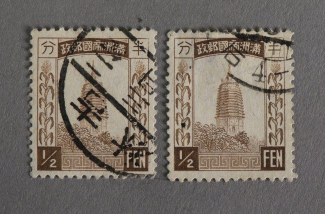 Two "half cent" Chinese stamps, Man Ord.4 3rd Print Ordinary Issue, with postmarks, 1934.11.1; 18.5 mm x 22.5 mm; Provenance: private Canadian collector