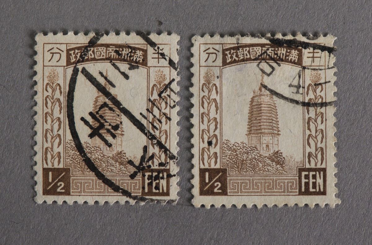 Two "half cent" Chinese stamps, Man Ord.4 3rd Print Ordinary Issue, with postmarks, 1934.11.1; 18.5 mm x 22.5 mm; Provenance: private Canadian collector