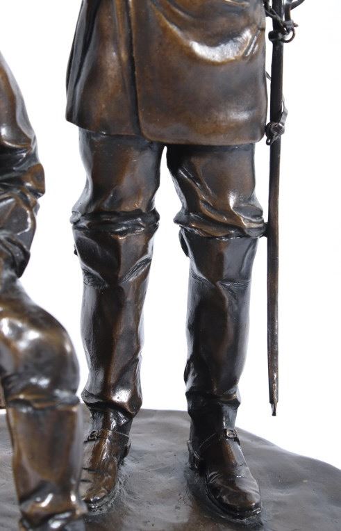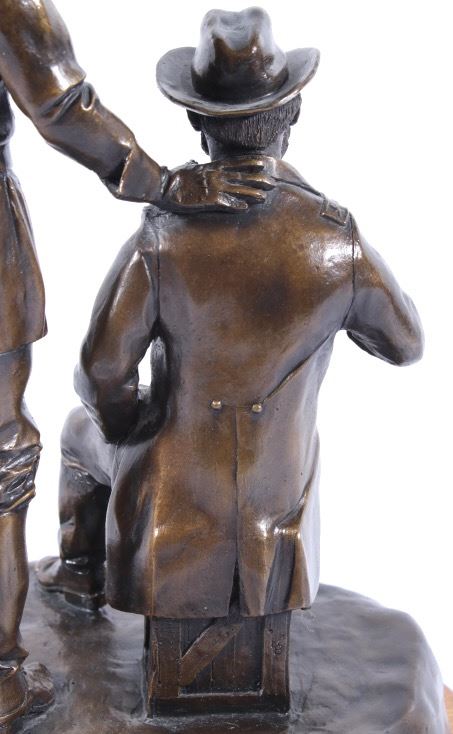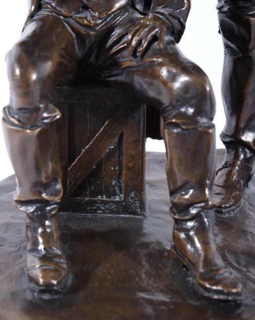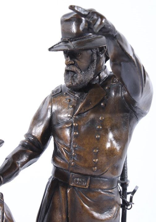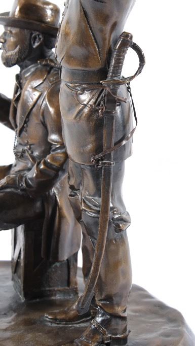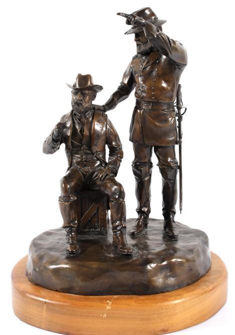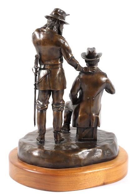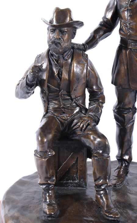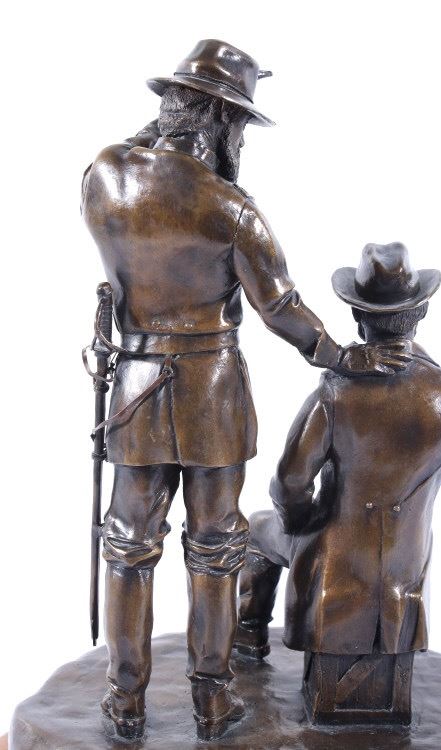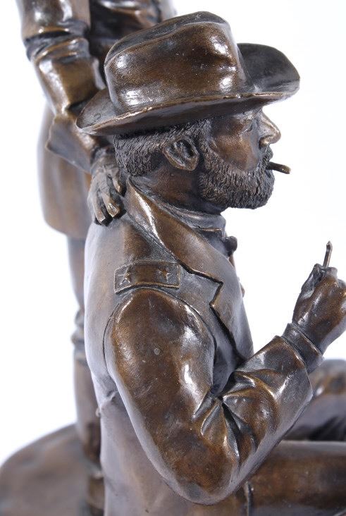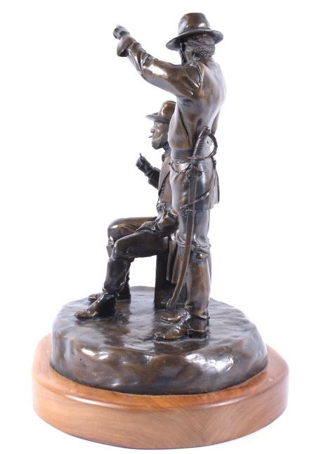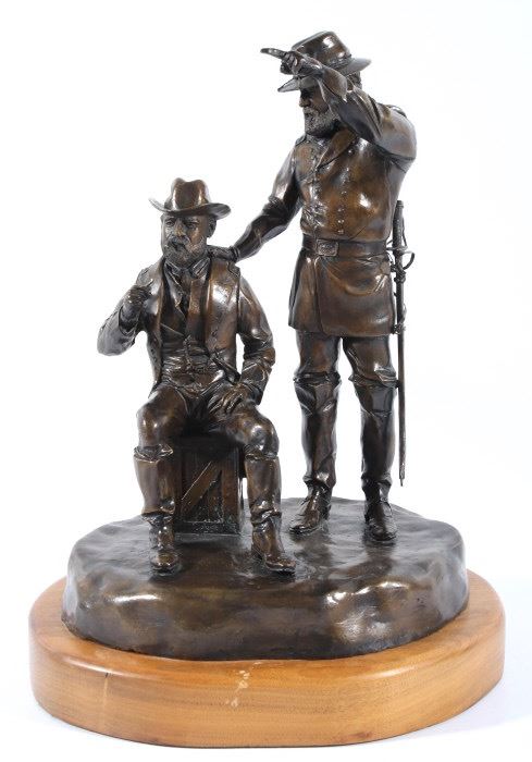 Included in this lot we have a bronze statue of Civil War two star generals by J J Star. The piece shows a pair of civil war era two star generals that seem to be in the midst of conversation. One of the generals is shown sitting on a wooden crate lighting a cigar with his uniform jacket open reveling the vest underneath. The second general is shown standing to the side, one hand pointing off into the distance the other resting on the seated mans shoulder. The figures show wonderful and intricate detail. The piece is set on a thick wooden base and is marked across the back. The back reads "1/25 JS" indicating that is was sculpted by artist J J Star and is one of only 25 made. The piece shows good condition overall. It measures approximately 16 1/2" tall by 12" wide and 10 1/2" deep.