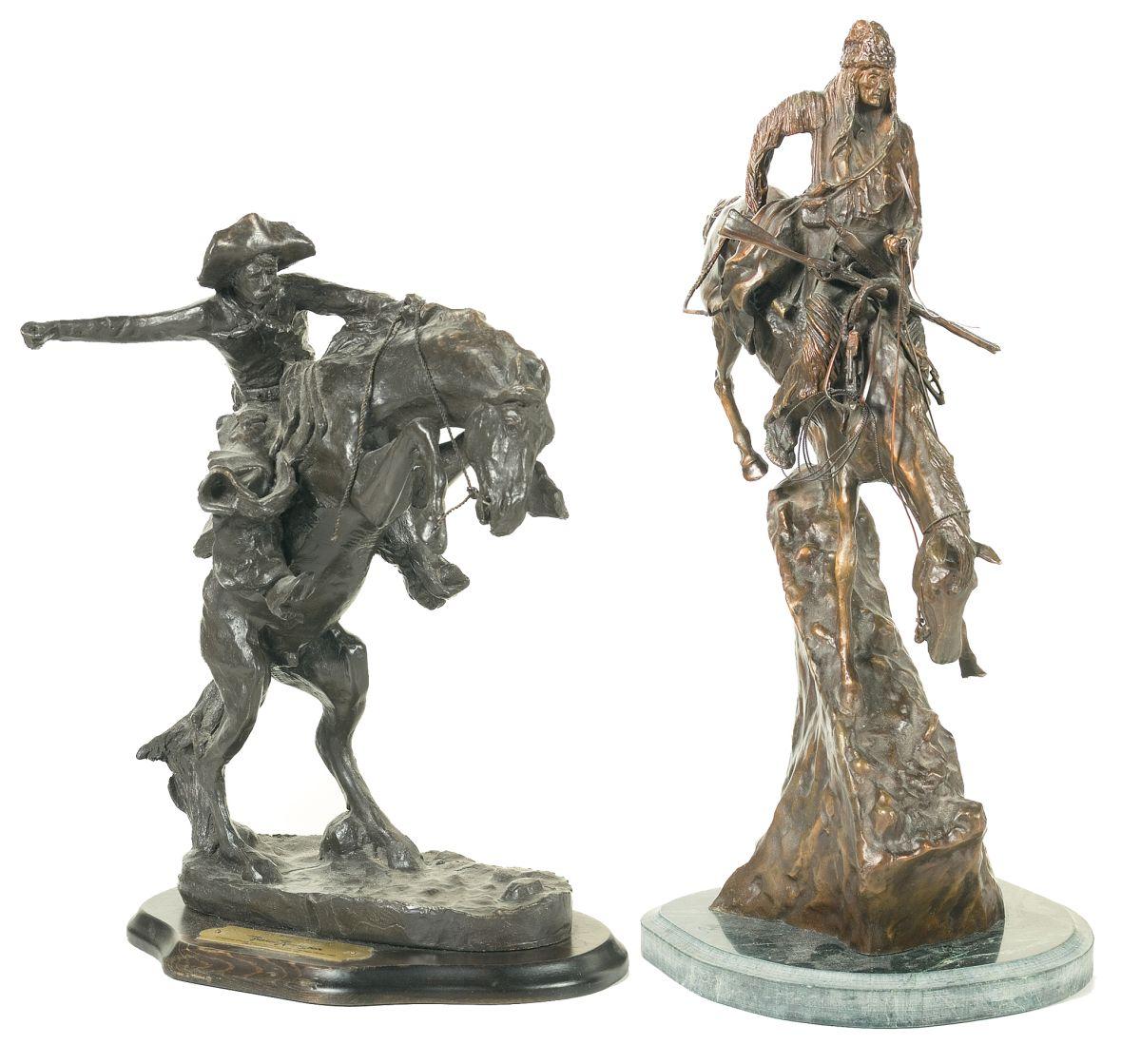 1) "The Bronco Buster" statue signed Dave Grossman. 2) Mountainman on horseback statue signed Fredrick Remington. Excellent, some minor handling marks, 1 has a minor chip on a stirrup.