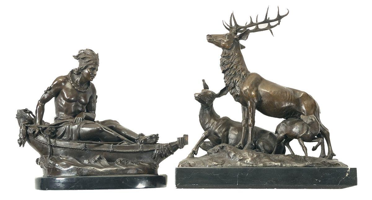 1) Native American in a canoe statue signed by "DUCHOISELLE". 2) Elk family statue signed by Pierre Jules Mene (1810-77). Both in original box. Excellent with some minor handling marks on the bases.
