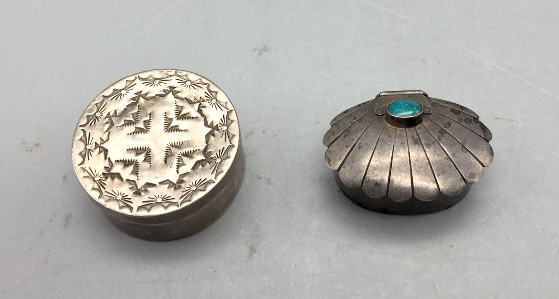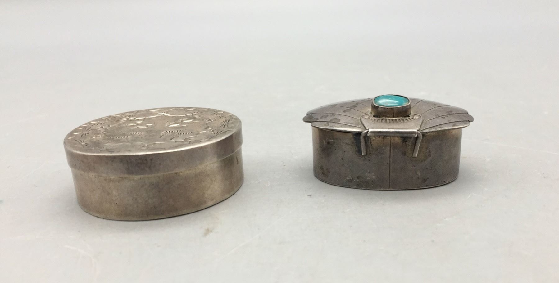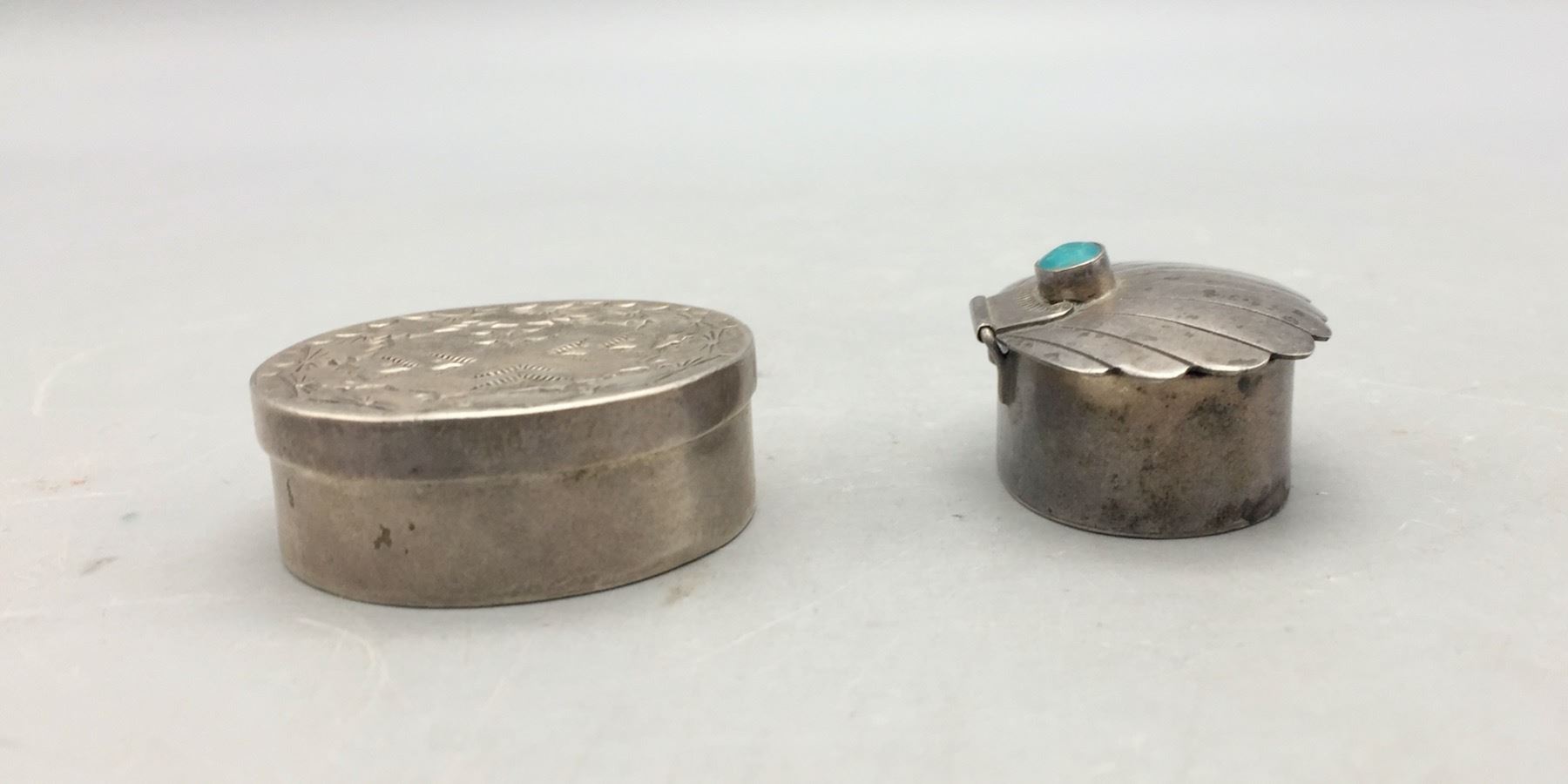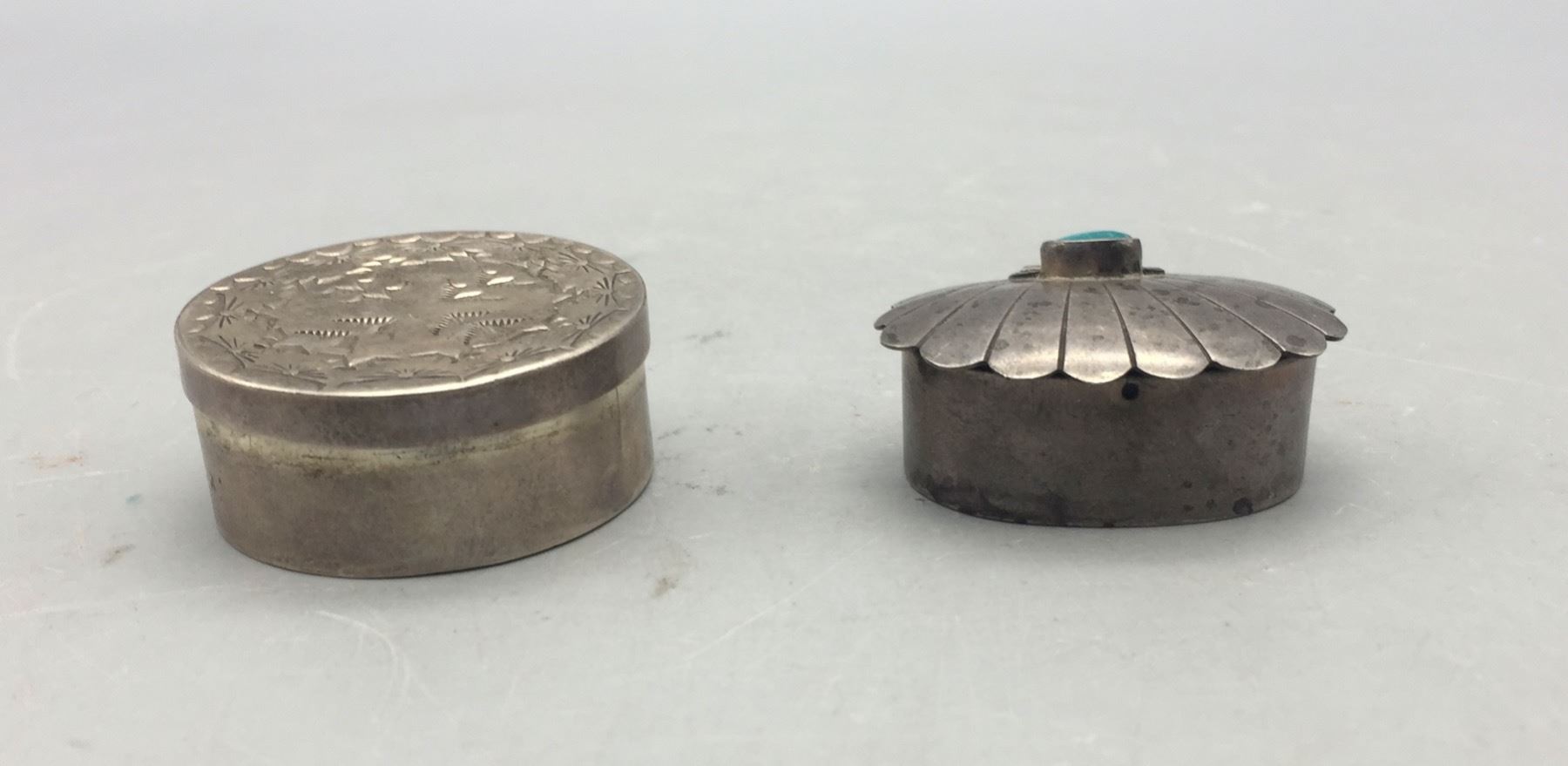 Description: Offered for sale in this lot are two sterling silver boxes. They vary in size and design. The one with turquoise on the lid appears to be a vintage Navajo box. The other one is more modern and is hallmarked with an E and sterling. Maker: Unknown. Approx. Age: Vintage to modern. Size: Various. Combined weight is 43.1 grams. Condition: Good for their age, normal wear expected. Please look closely at the pictures - they are an important part of our description. Shipping: There will be a $5 handling, packaging fee for shipping this lot. The actual cost of postage will be added on top of that.