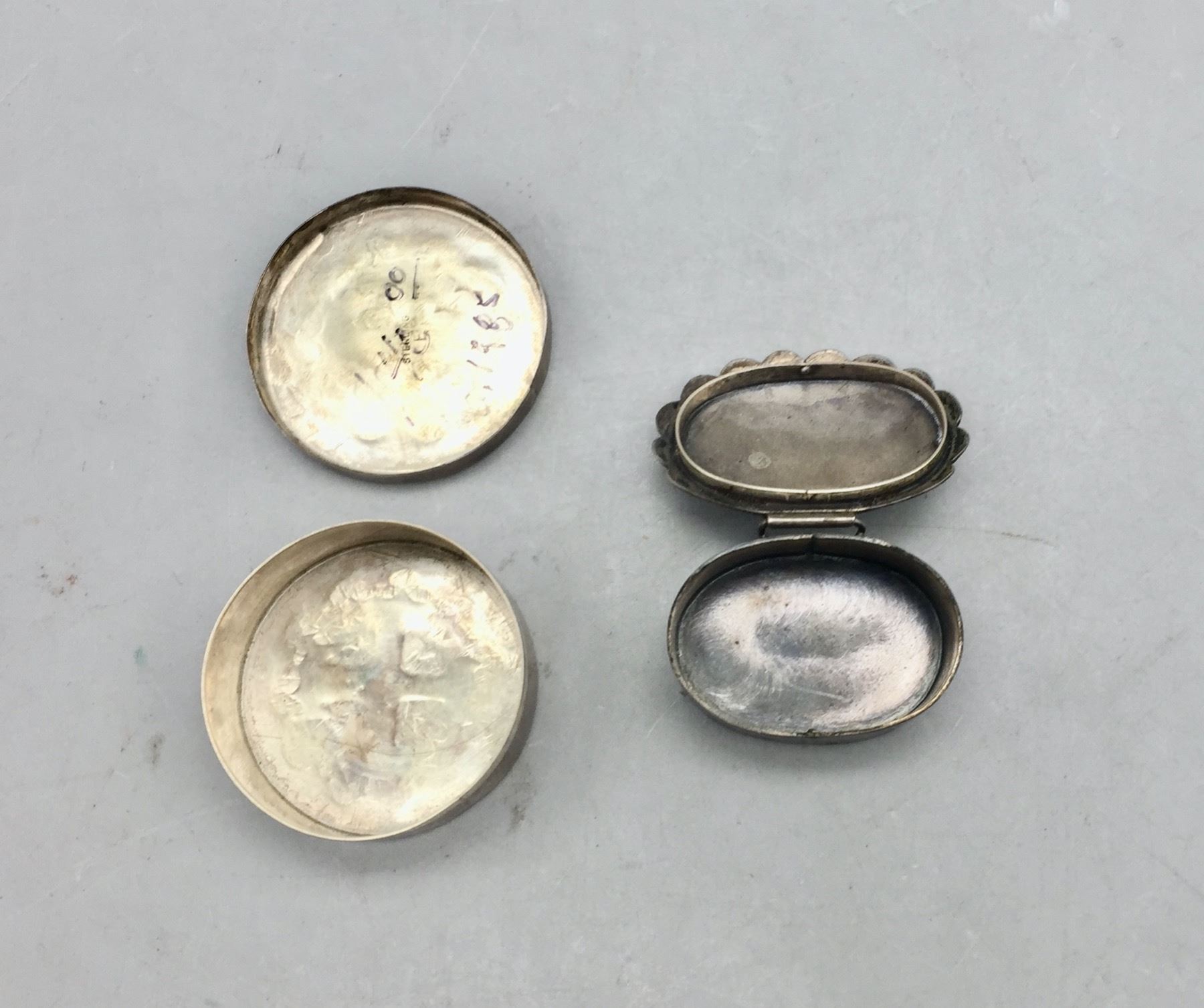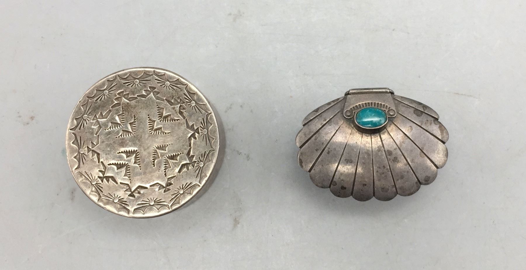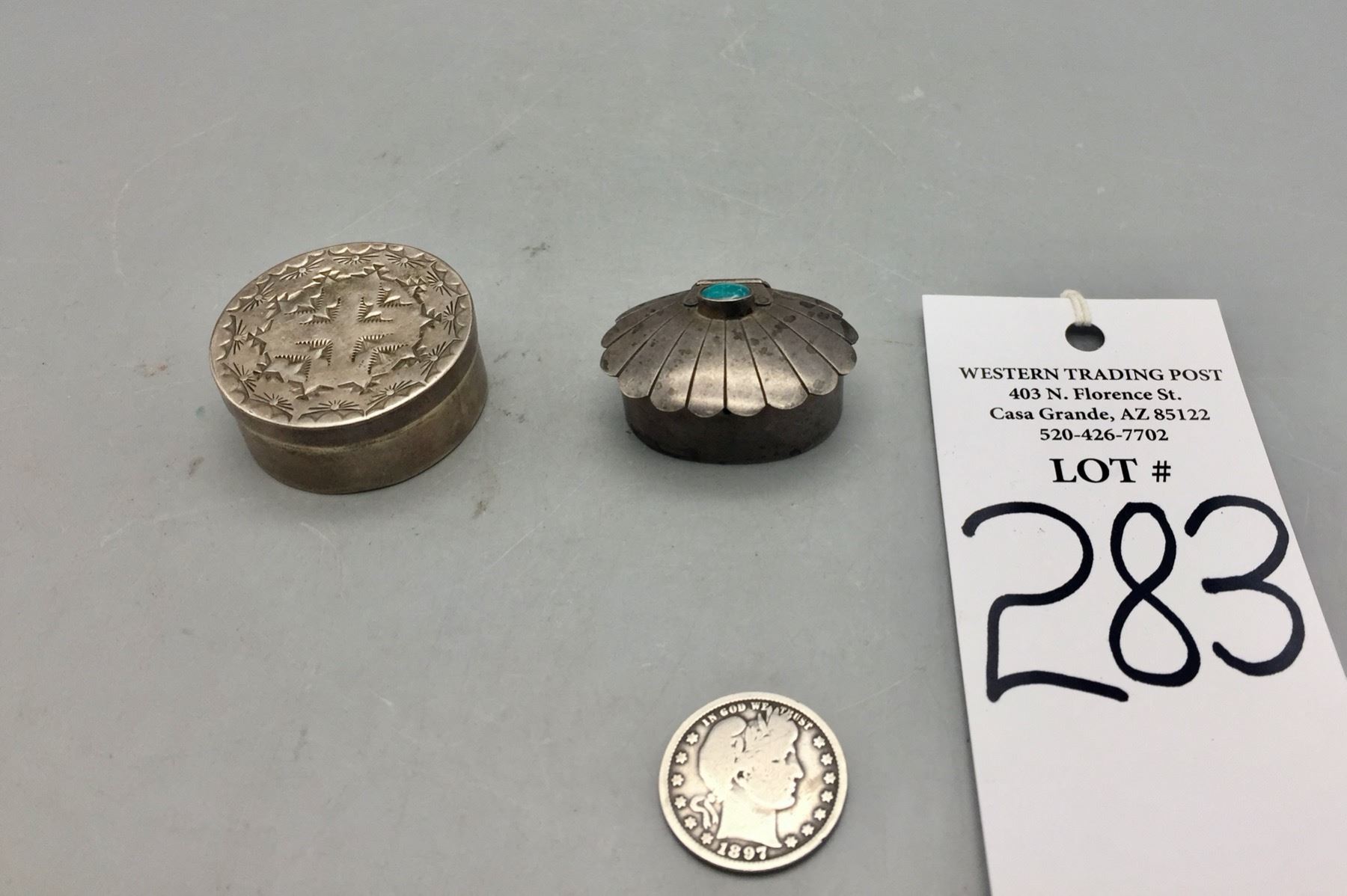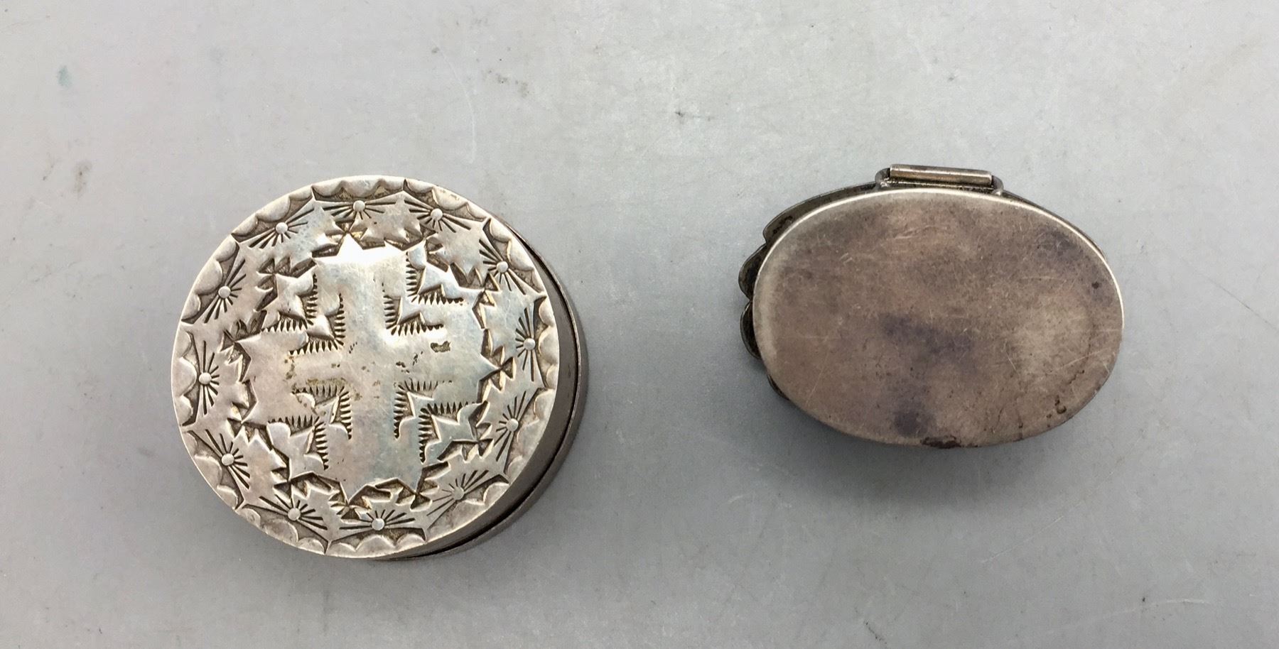 Description: Offered for sale in this lot are two sterling silver boxes. They vary in size and design. The one with turquoise on the lid appears to be a vintage Navajo box. The other one is more modern and is hallmarked with an E and sterling. Maker: Unknown. Approx. Age: Vintage to modern. Size: Various. Combined weight is 43.1 grams. Condition: Good for their age, normal wear expected. Please look closely at the pictures - they are an important part of our description. Shipping: There will be a $5 handling, packaging fee for shipping this lot. The actual cost of postage will be added on top of that.