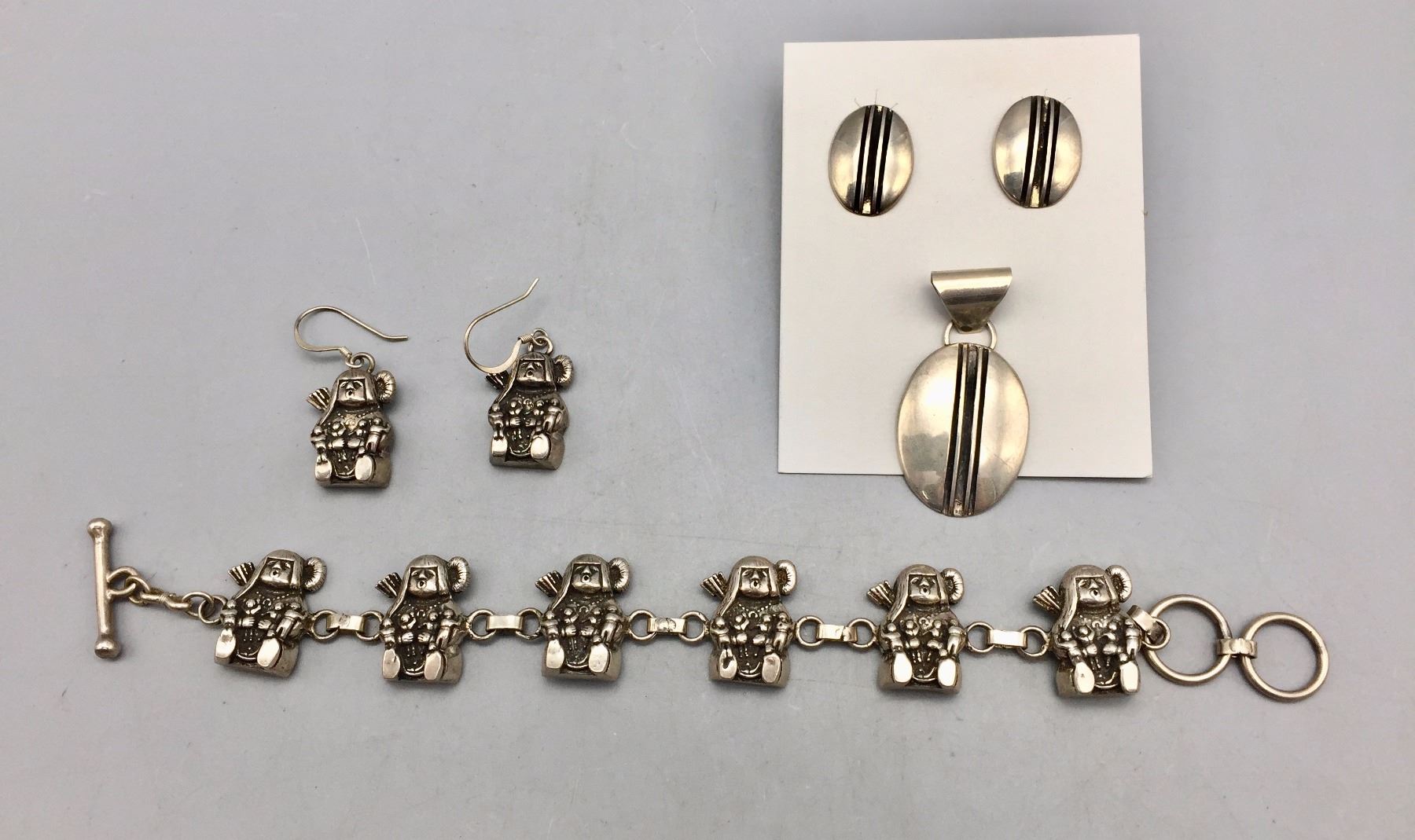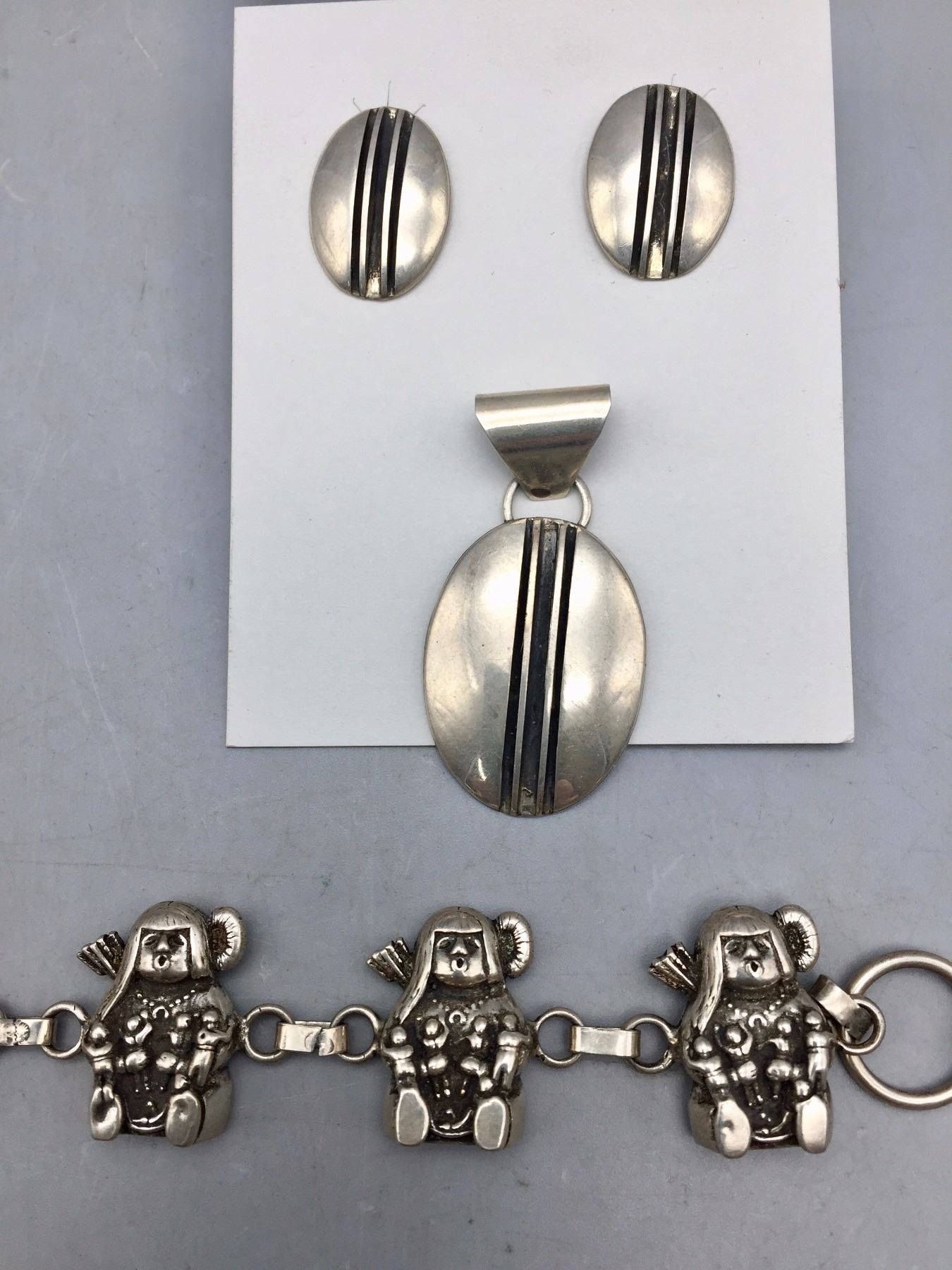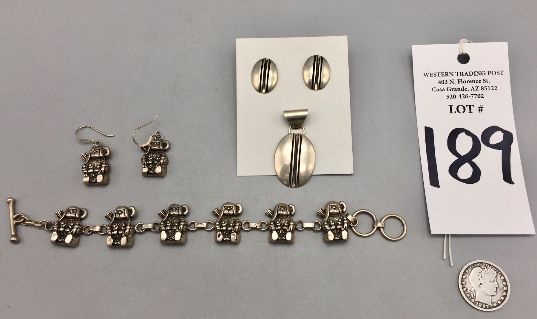 Description: A group of two different, sterling silver jewelry sets. One is a bracelet with earrings, the other is earrings and a pendant. Maker: Unknown. Approx. Age: Circa 1980s or newer. Size: Combined weight of 58.5 grams. Condition: Good for its age, normal wear expected. Please look closely at the pictures - they are an important part of our description. Shipping: There will be a $5 handling / packaging fee for shipping this lot. The actual cost of postage will be added on top of that.