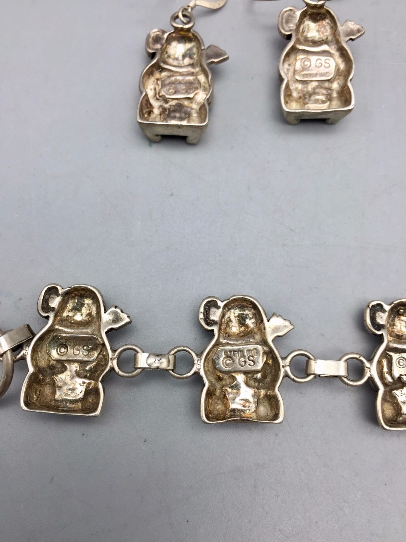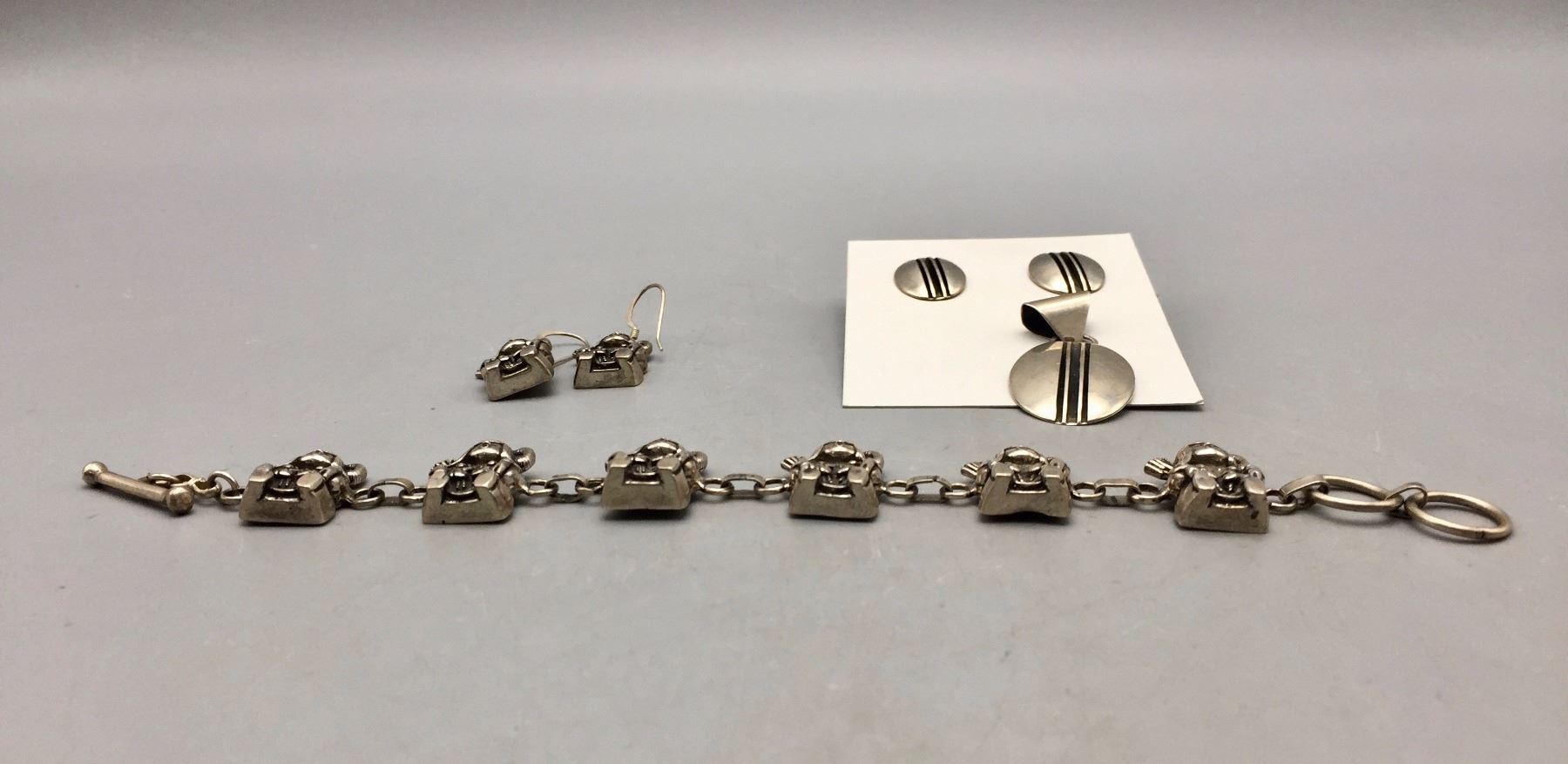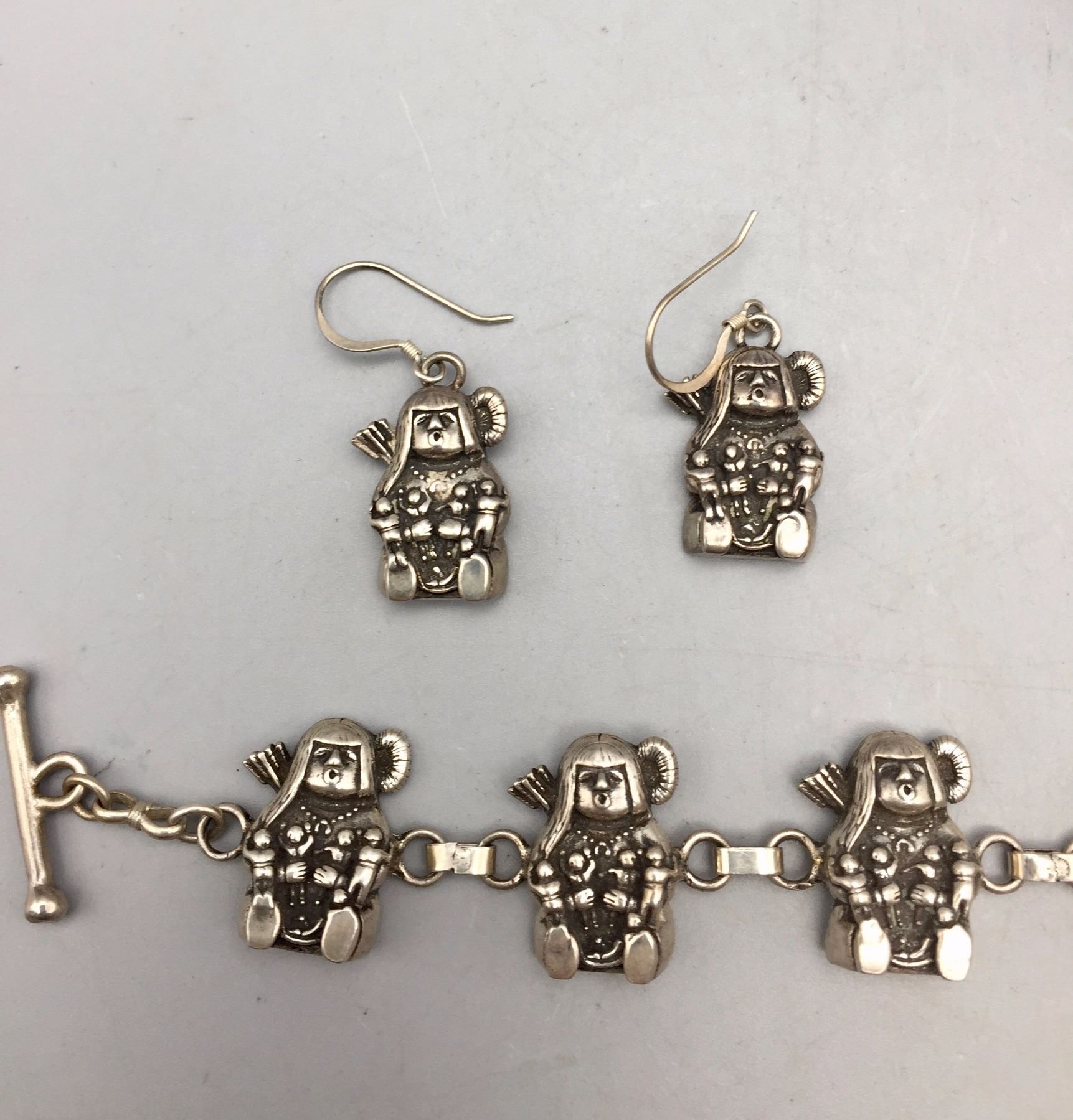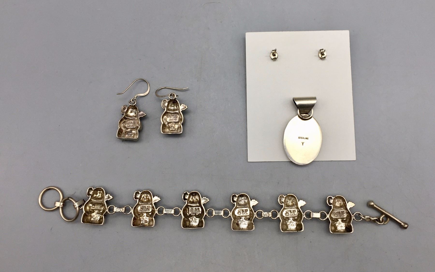 Description: A group of two different, sterling silver jewelry sets. One is a bracelet with earrings, the other is earrings and a pendant. Maker: Unknown. Approx. Age: Circa 1980s or newer. Size: Combined weight of 58.5 grams. Condition: Good for its age, normal wear expected. Please look closely at the pictures - they are an important part of our description. Shipping: There will be a $5 handling / packaging fee for shipping this lot. The actual cost of postage will be added on top of that.