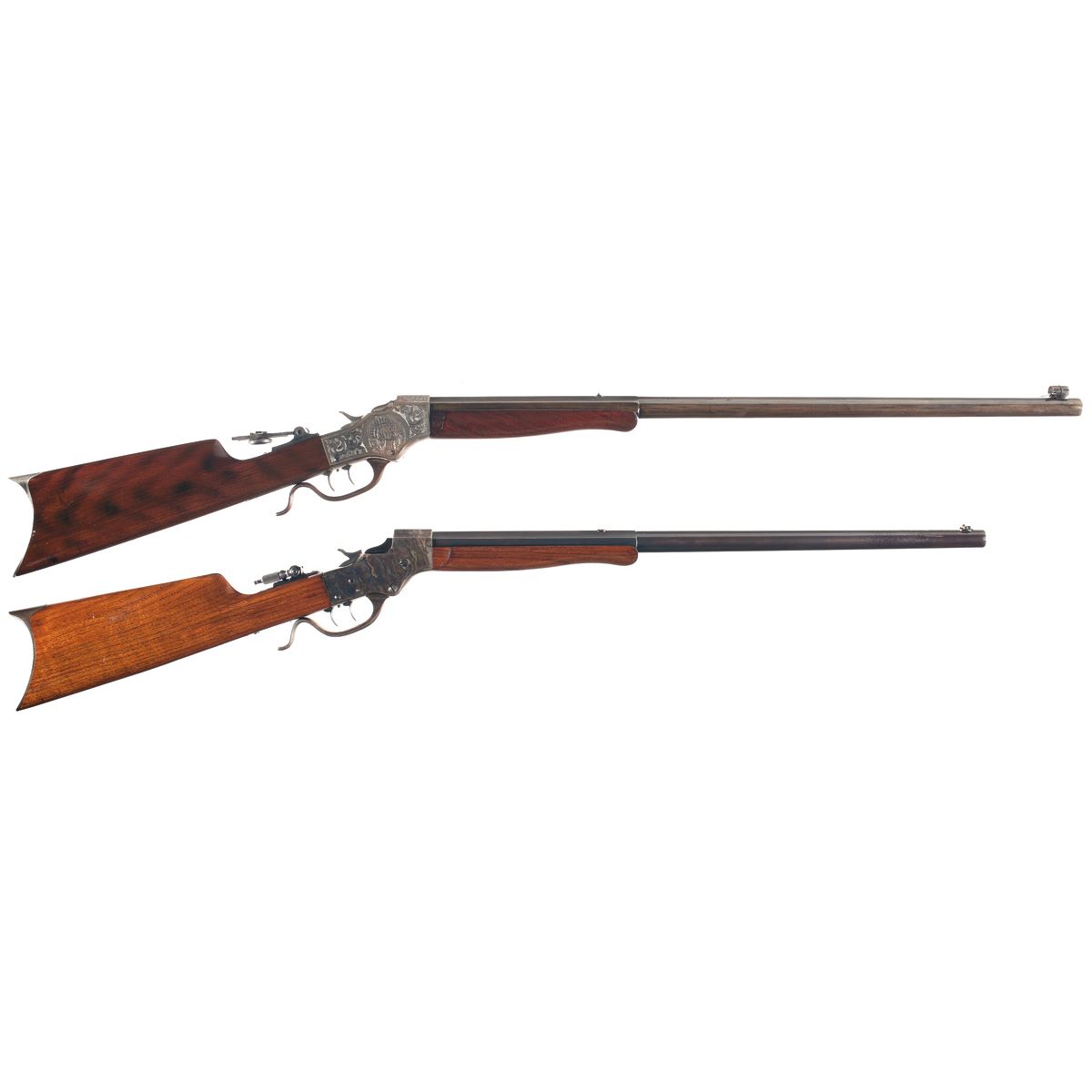 Manufactured circa 1896 to 1916. Scroll, punch dot, and animal scene engraved action, tang peep sight and double set triggers.