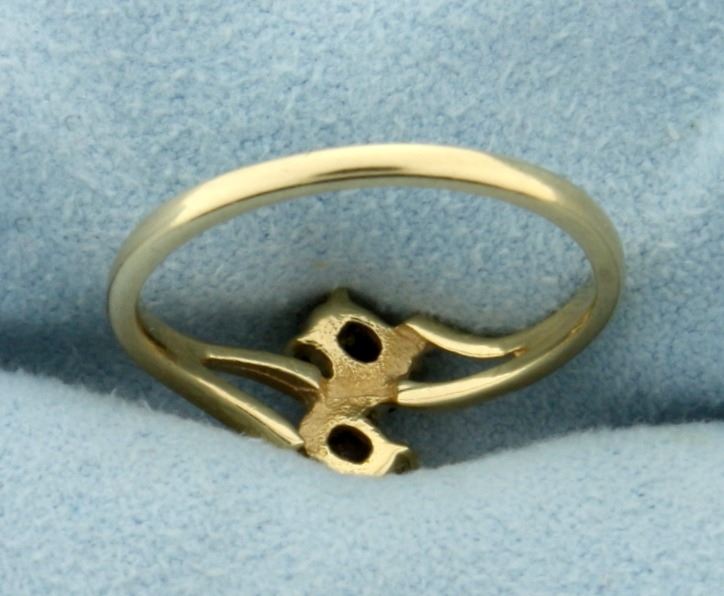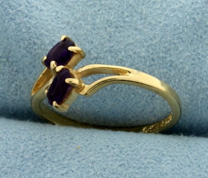 In 14K Yellow Gold. Contains two natural 5x3mm oval shaped Amethyst gemstones with bright purple color and excellent clarity. Size 5 1/2. 1.8g
