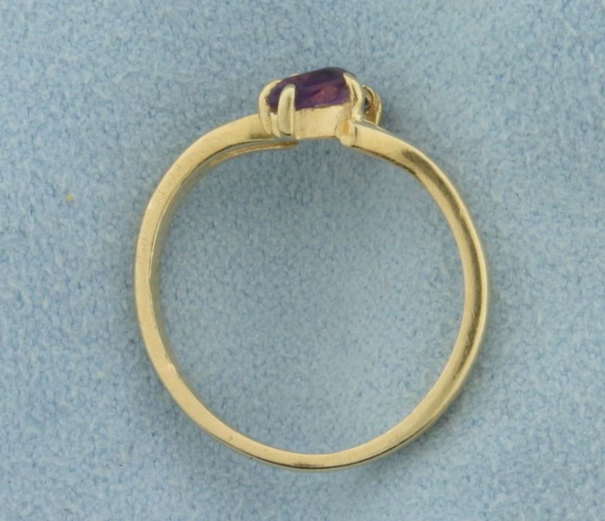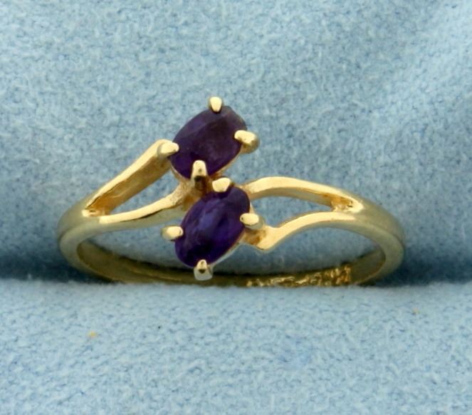 In 14K Yellow Gold. Contains two natural 5x3mm oval shaped Amethyst gemstones with bright purple color and excellent clarity. Size 5 1/2. 1.8g