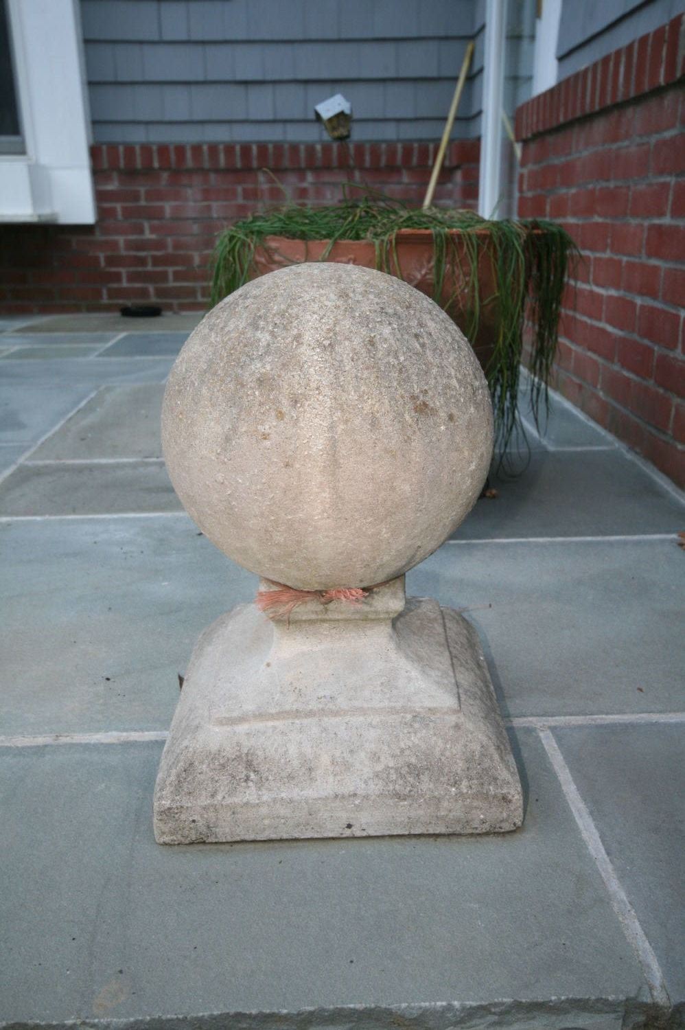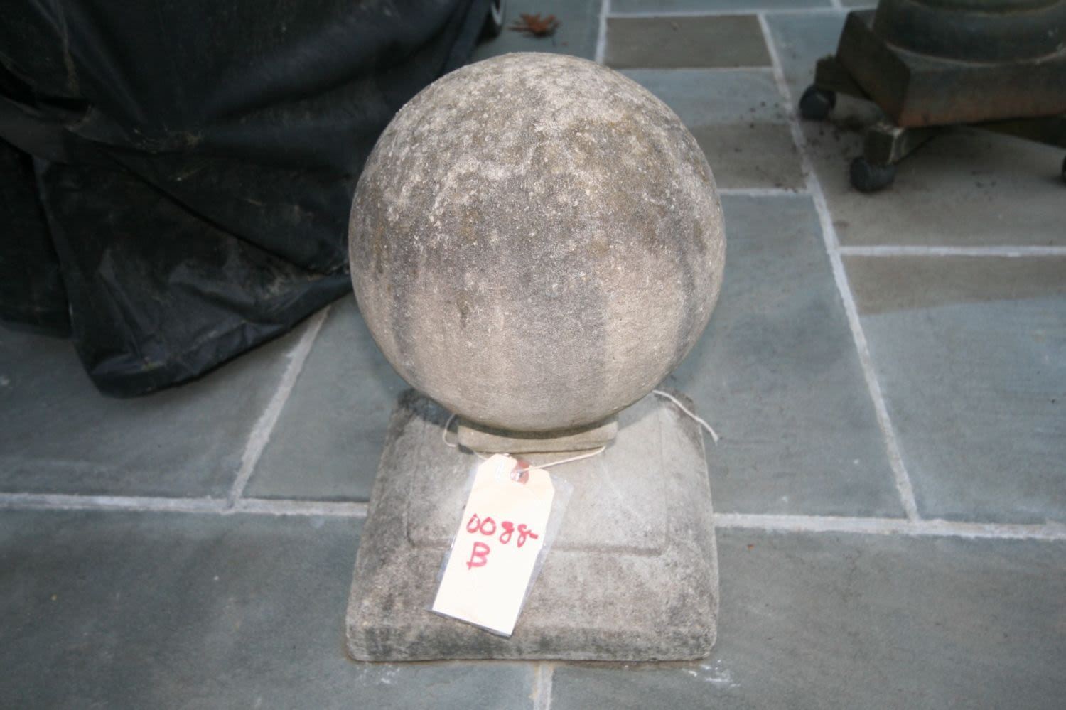 Two Stone Garden Post Finial Balls with Stepped Base. Dimensions 18"h to center of ball 12" square base.