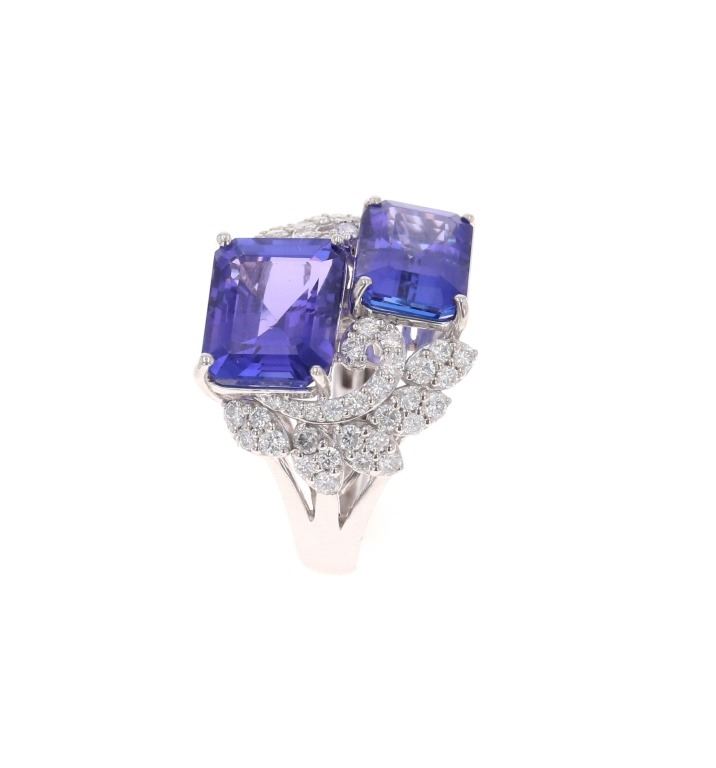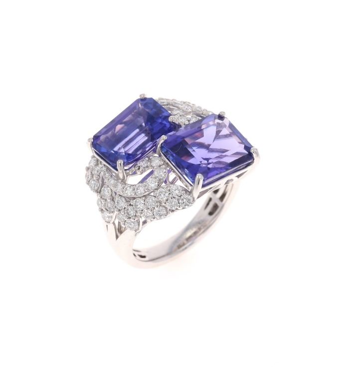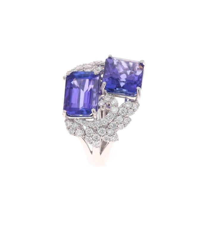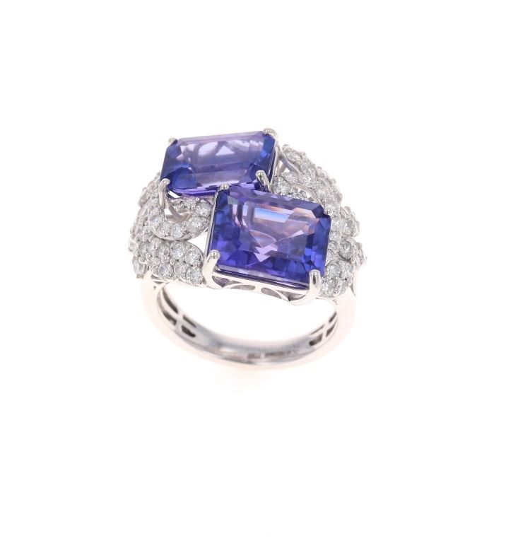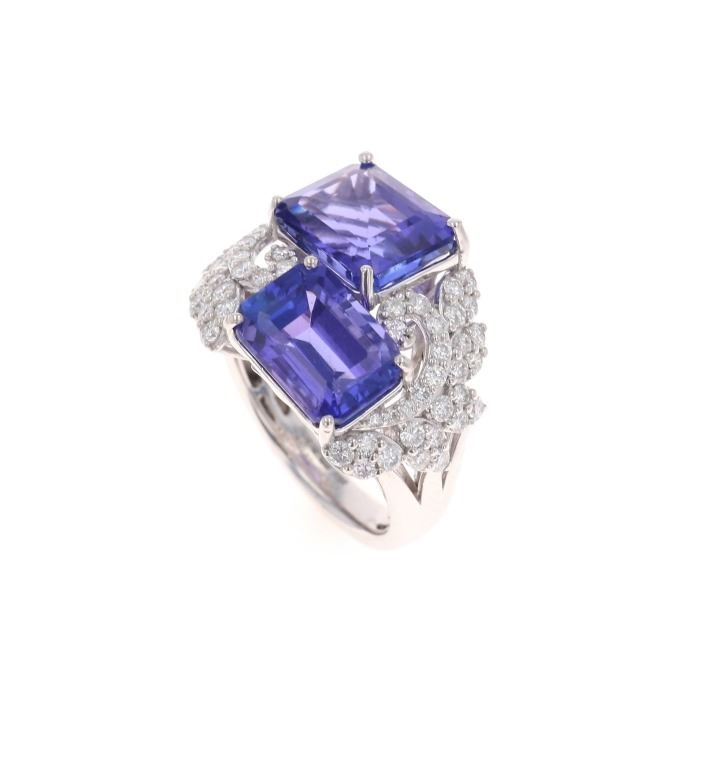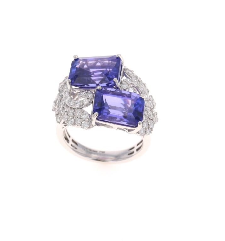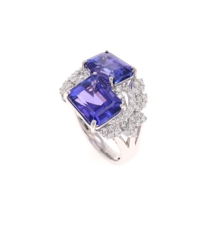 Featured in this lot is this two stone tanzanite and VS2 diamond platinum ring with GGA paperwork. The ring features a wonderfully and professionally crafted platinum construction and shows a 'Oscar Friedman' hallmark and shows a 'PT950'. The two center stones are natural emerald, faceted cut tanzanite gemstones that measure 11.34 x 9.15 and 11.02 x 8.04mm and are considered type I with bluish violet with excellent symmetry that shows a a total weight of 10.67 carats. The floral decorated shoulders are set with a total of 60 round brilliant cut diamonds with measurements of 1.9 x 1.0mm and shows the average clarity of VS2 - SI1 and an average color of F - G and a total weight of 1.12 carats. Tanzanite Is a very rare precious gemstone that is only found in the Usumburu Mountains that border the Umba Valley of northern Tanzania. Originally discovered in 1967 by Tiffany & Company who named the stone Tanzanite. Tanzantite is unique due to its exceptional pleochroism (an optical phenomenon in which a stone has different colors when observed at different angles). The piece comes complete with GGA(GemAssure Gemological Appraisals, GGA Appraisal Number#: GGA063340 and trace number: RN033464) report and appraisal confirming the above info and giving a total value of $43,570.00. The ring size is US 7 1/2.