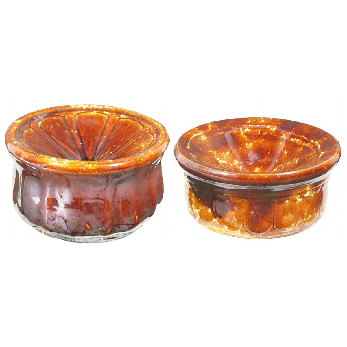 Two Stoneware Spittoons including an Original Bennington Rockingham, No chips or cracks. 7 1/2 inch diameter X 4 1/2 inches tall. And a White Porcelain Spitton. No chips or cracks. 9 1/2 inch diameter X 5 inches tall.