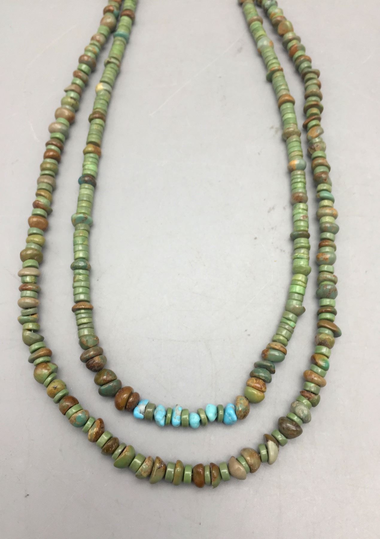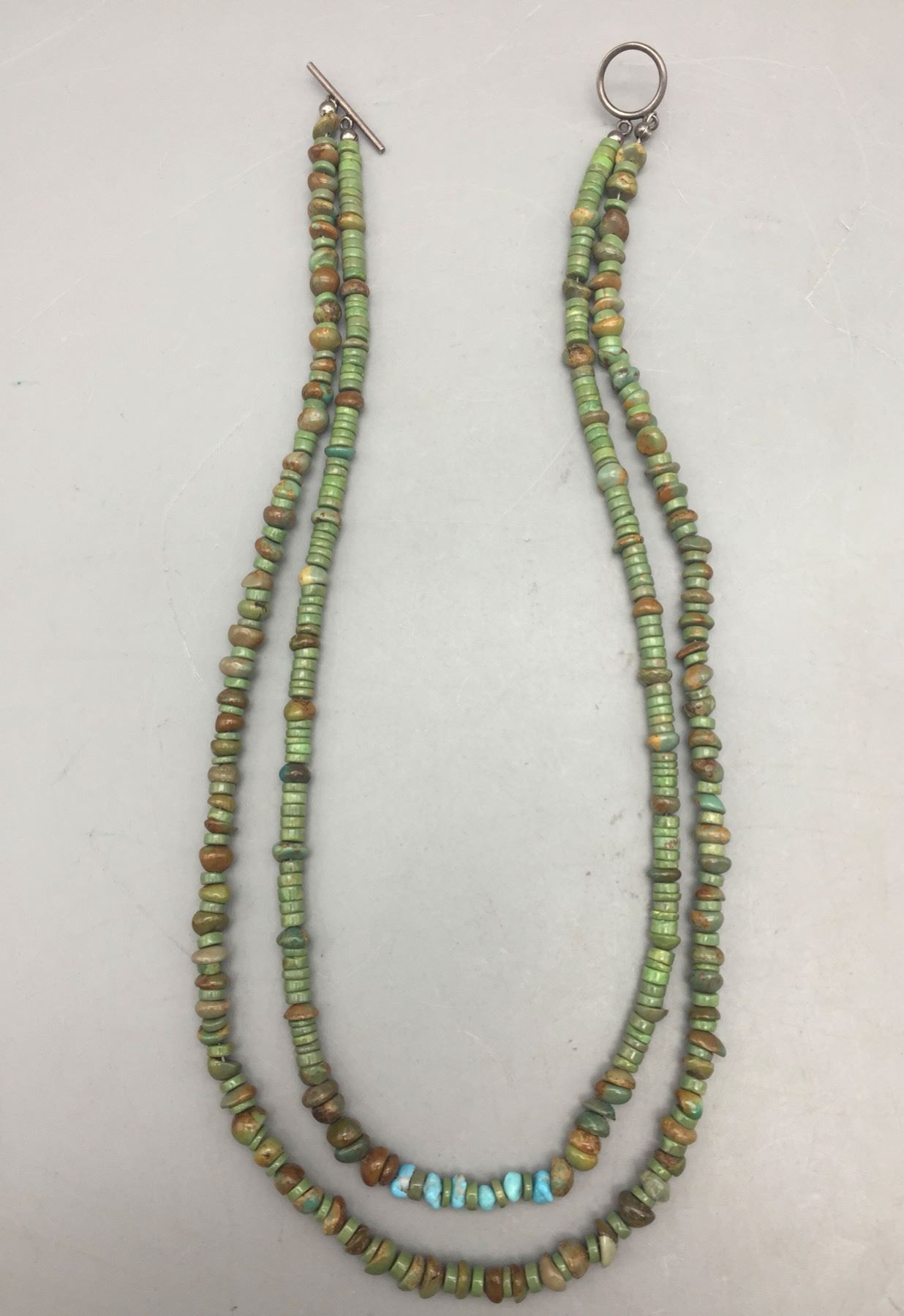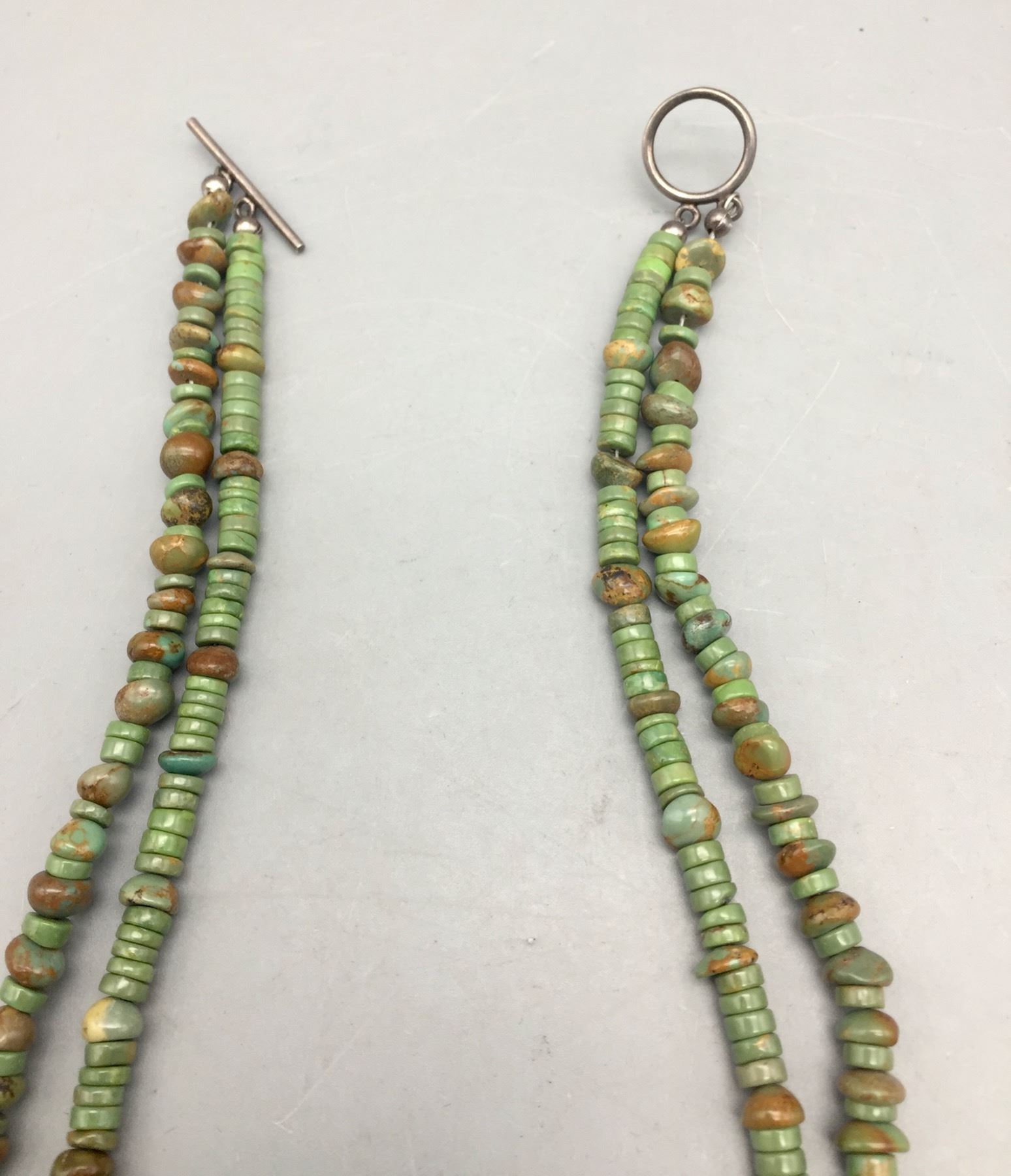 Description: For sale in this lot we have a lovely two strand turquoise necklace, strung with green turquoise beads with light blue turquoise accents. Findings are sterling. Maker: Unknown. Approx. Age: Modern. Size: Fits a 15” neck. Weighs a 29.4 grams. Condition: Good. Please look closely at the pictures - they are an important part of our description. Shipping: There will be a $5 handling / packaging fee for shipping this lot. The actual cost of postage will be added on top of that.