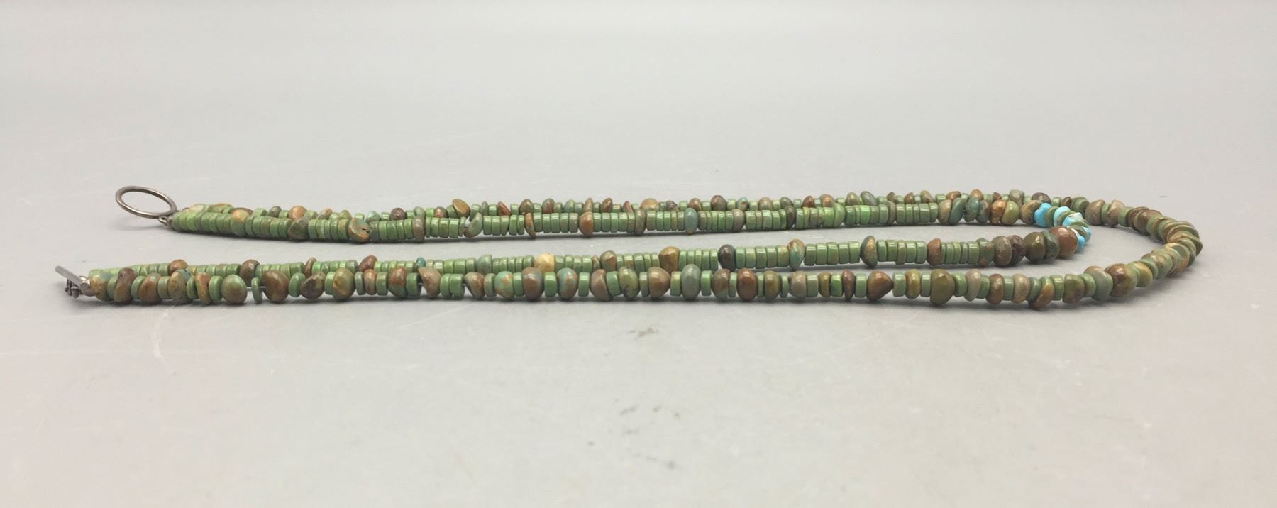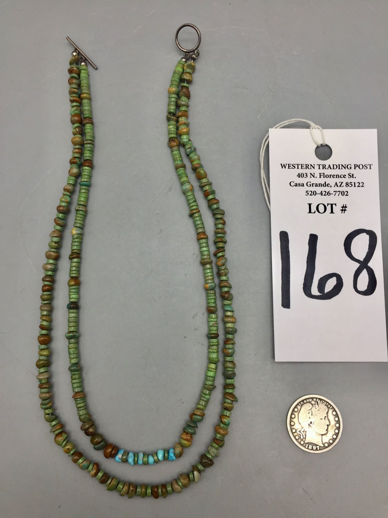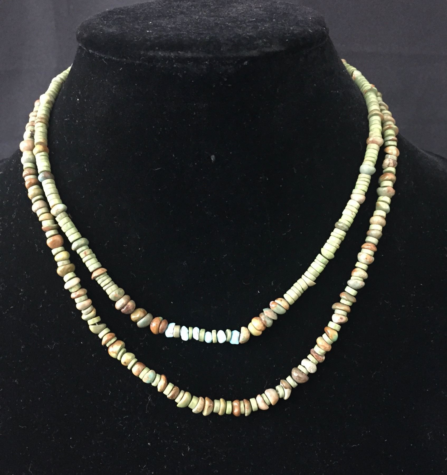 Description: For sale in this lot we have a lovely two strand turquoise necklace, strung with green turquoise beads with light blue turquoise accents. Findings are sterling. Maker: Unknown. Approx. Age: Modern. Size: Fits a 15” neck. Weighs a 29.4 grams. Condition: Good. Please look closely at the pictures - they are an important part of our description. Shipping: There will be a $5 handling / packaging fee for shipping this lot. The actual cost of postage will be added on top of that.