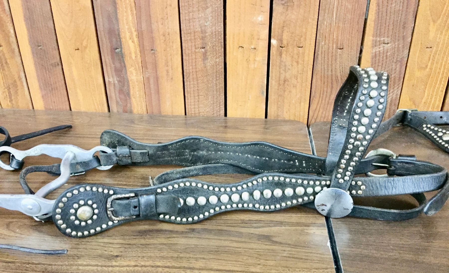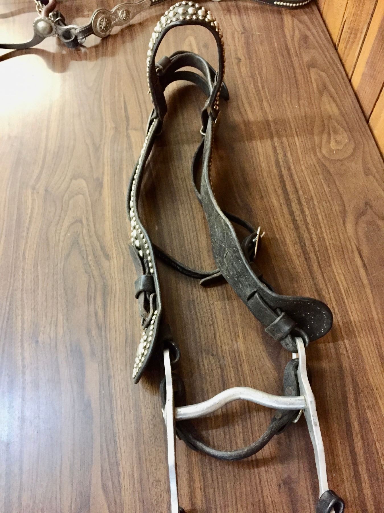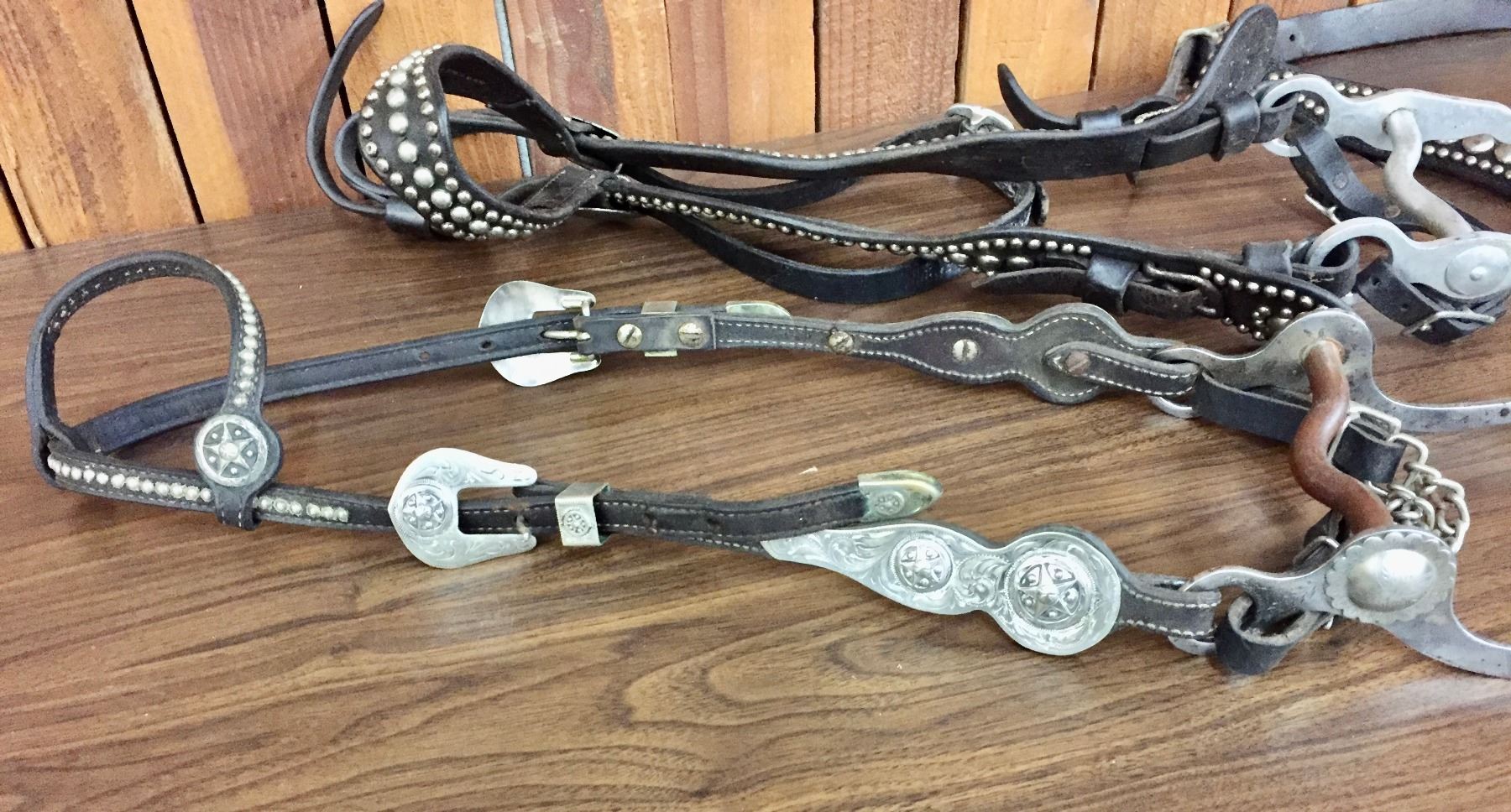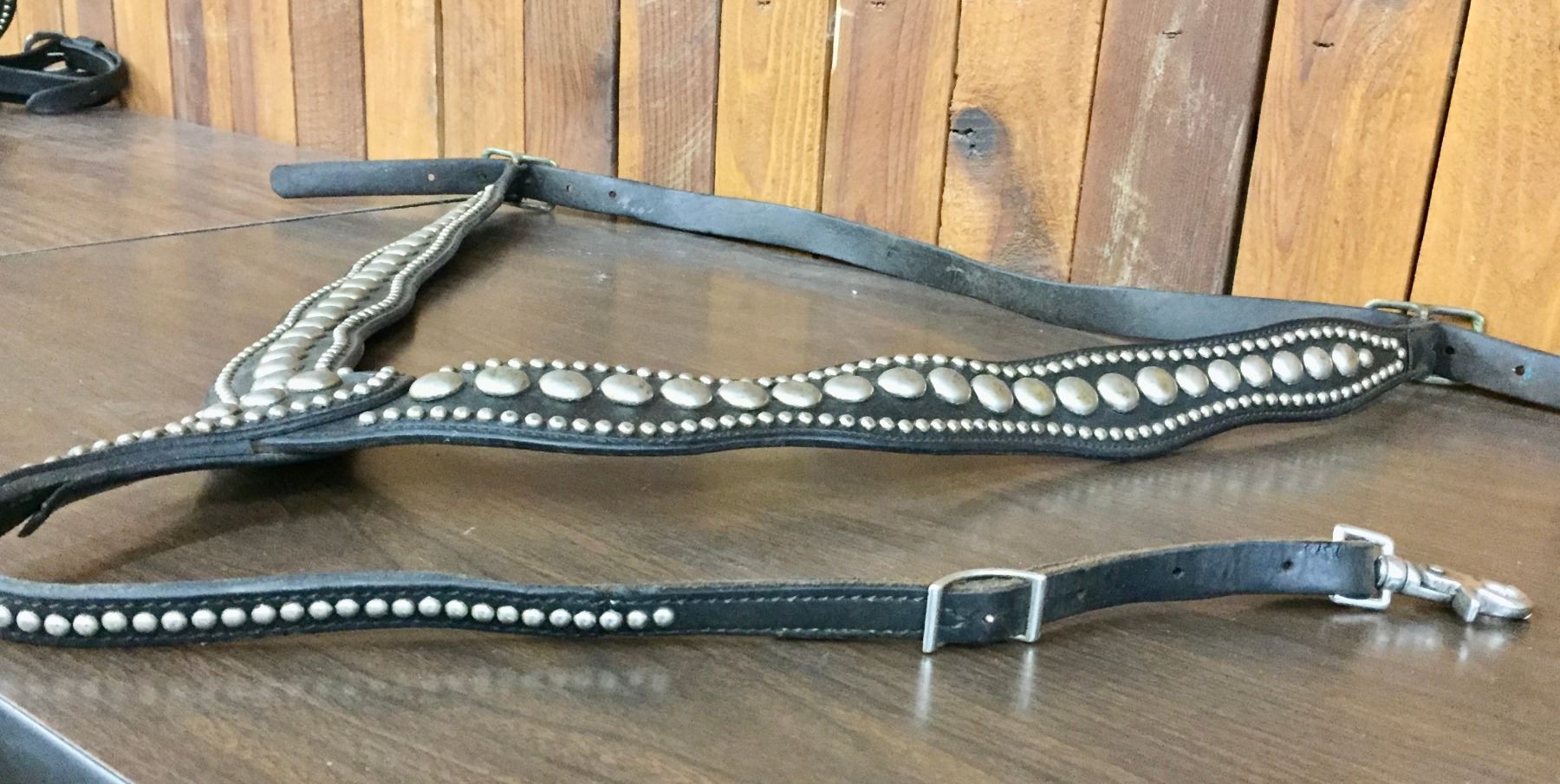 Description: Included for sale in this lot are two bridles with a breast collar, featuring dark leather with studded designs and silver conchos and leather accents. One of the bridles has a Crockett bit. Maker: Unknown.