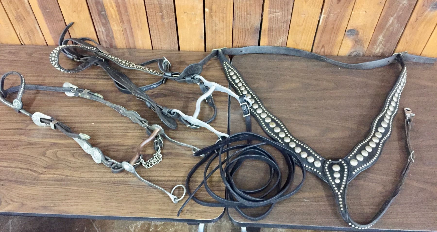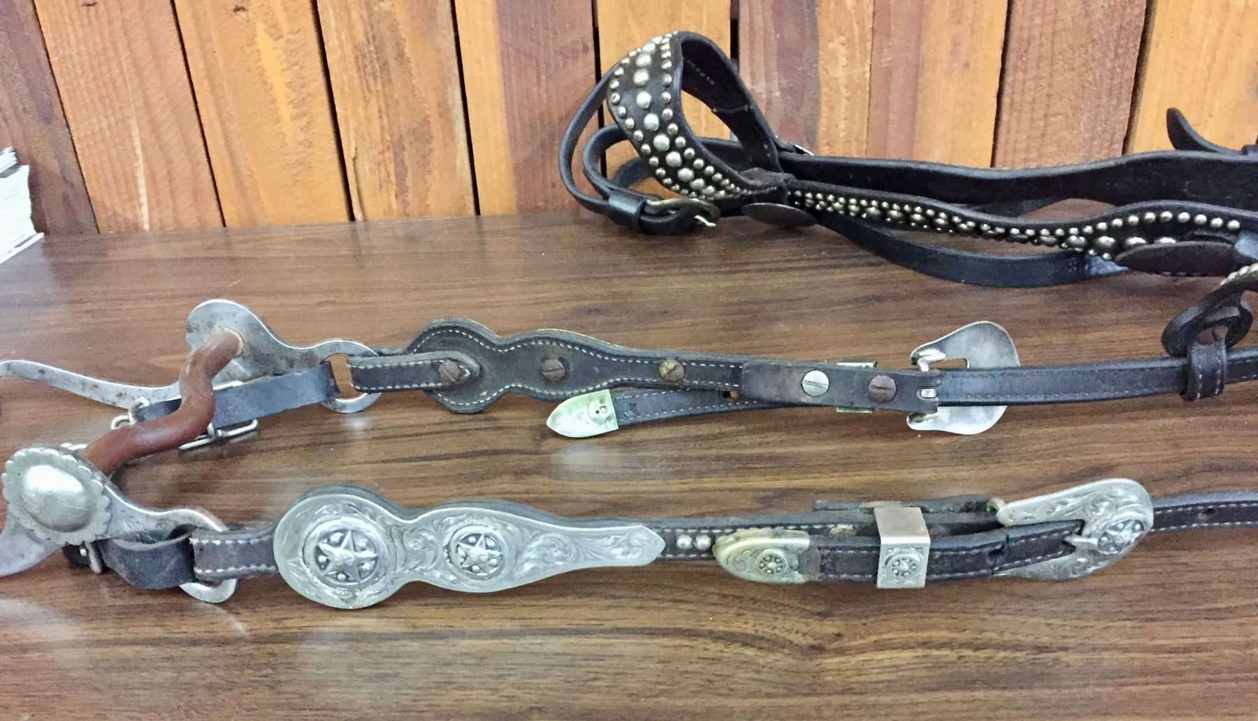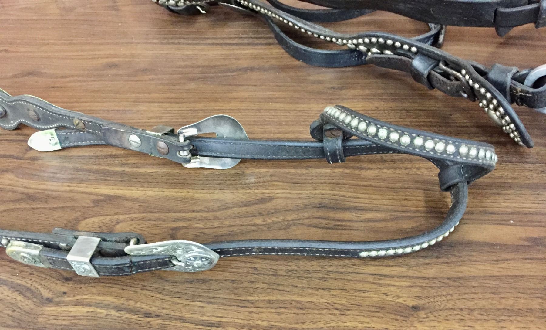 Description: Included for sale in this lot are two bridles with a breast collar, featuring dark leather with studded designs and silver conchos and leather accents. One of the bridles has a Crockett bit. Maker: Unknown.