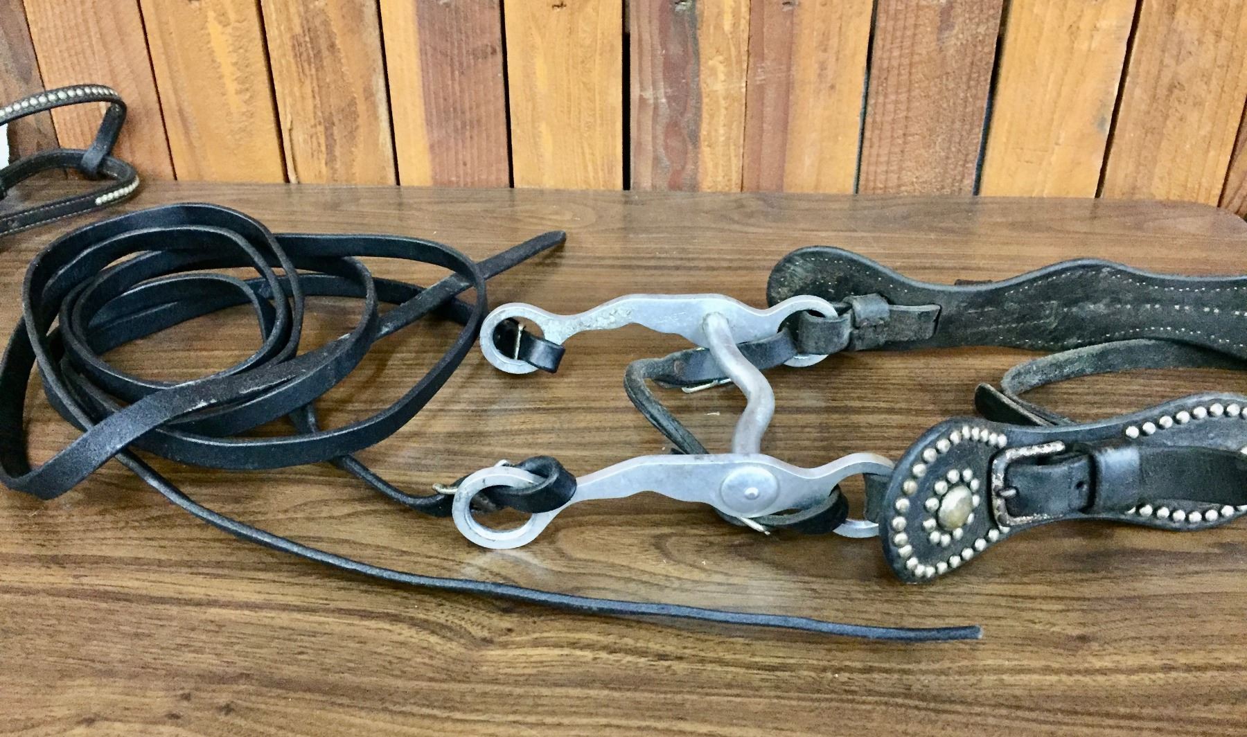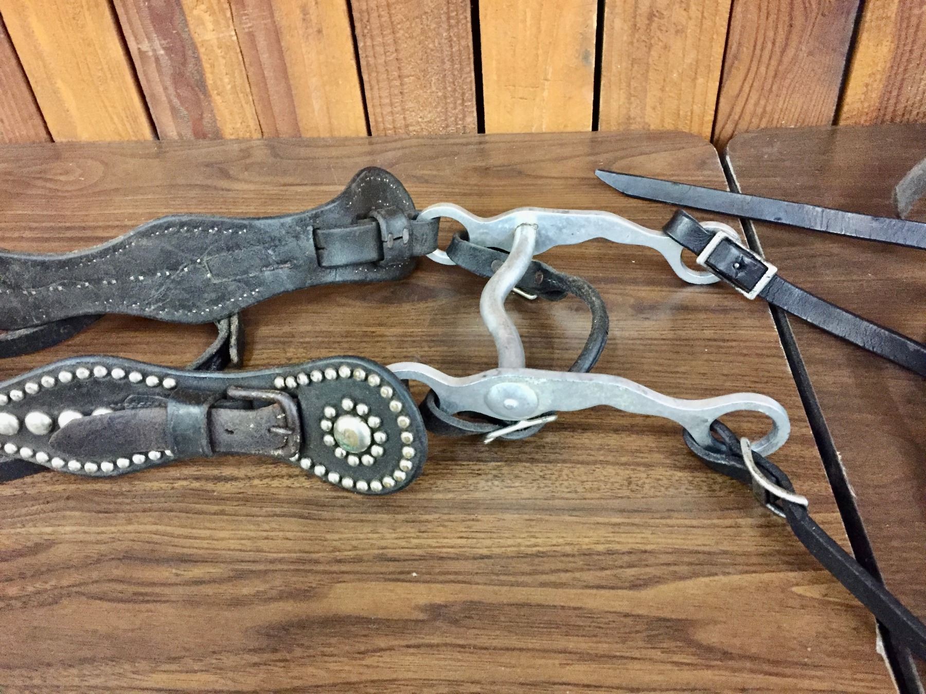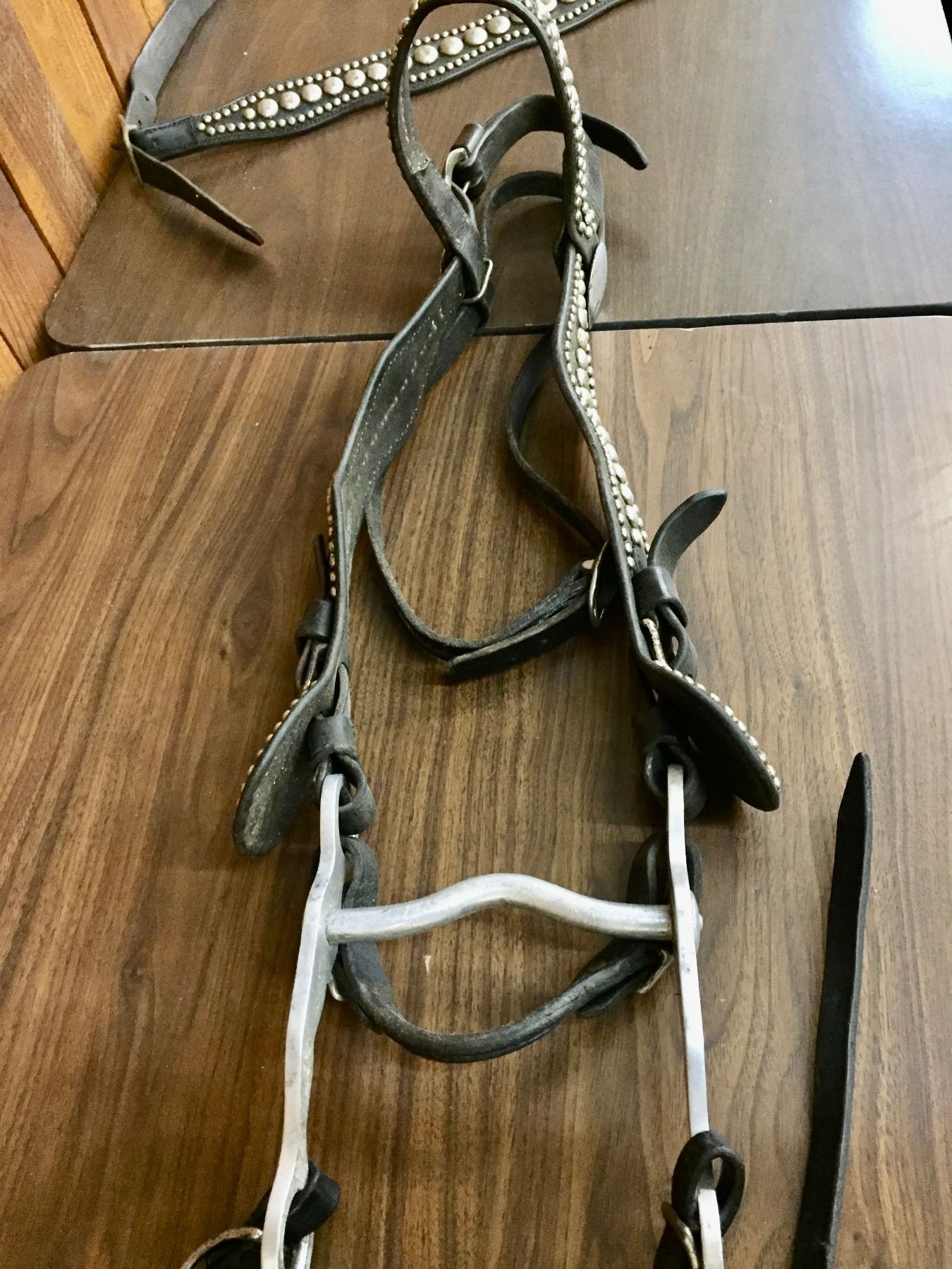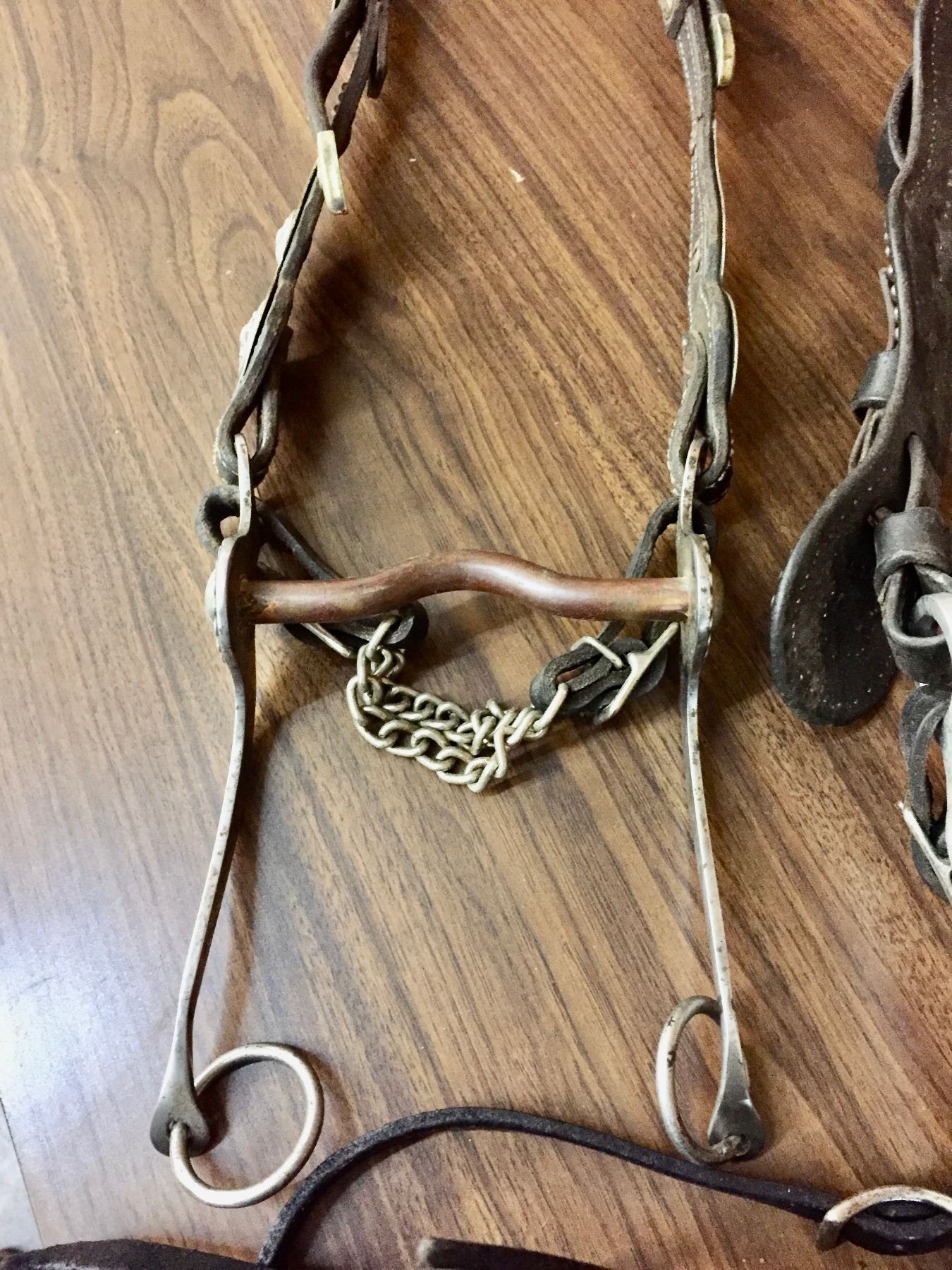 Description: Included for sale in this lot are two bridles with a breast collar, featuring dark leather with studded designs and silver conchos and leather accents. One of the bridles has a Crockett bit. Maker: Unknown.