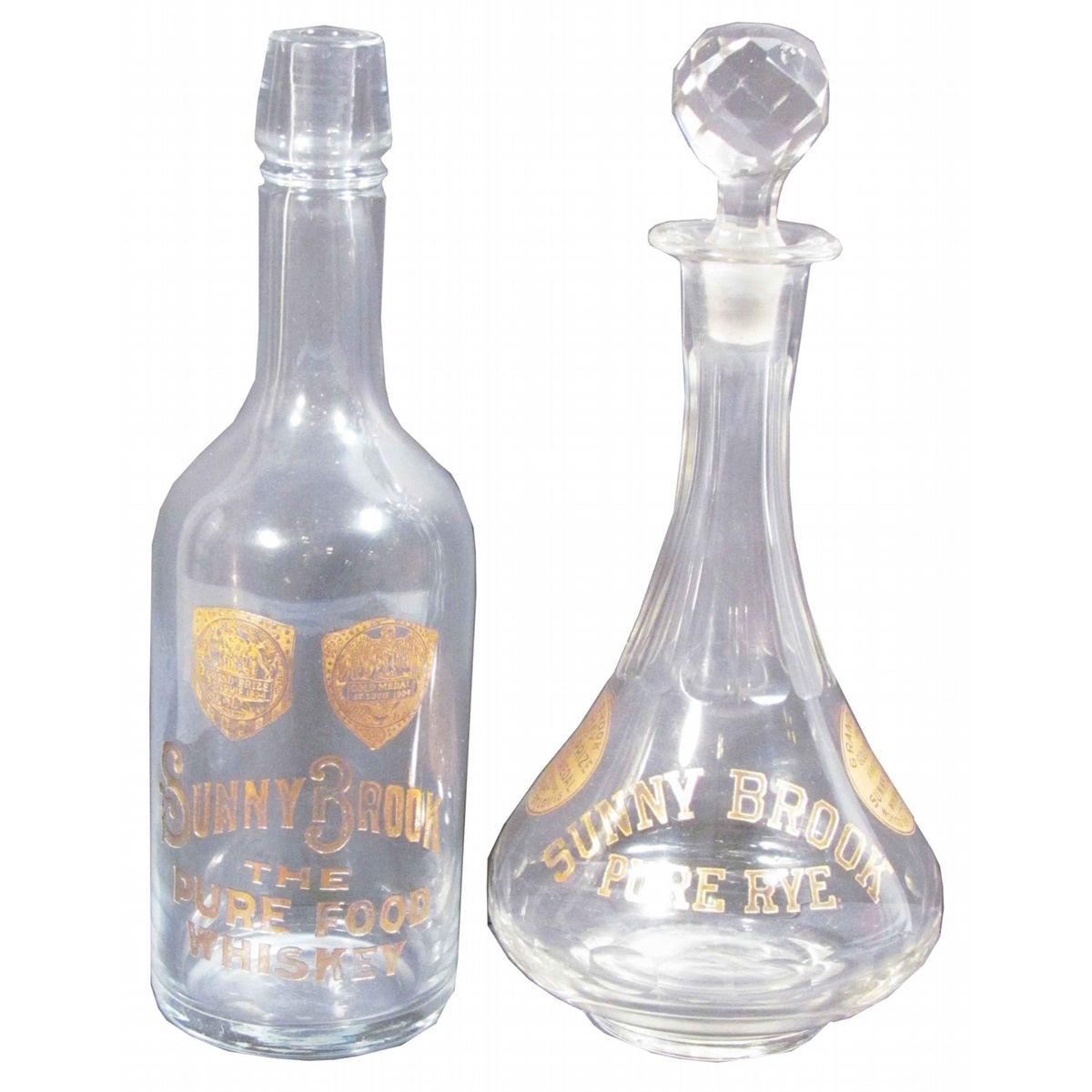 Two Sunny Brook Whiskey Etched Back Bar Bottles. One with ground glass lid and stopper. Each 11 1/2 inches tall.