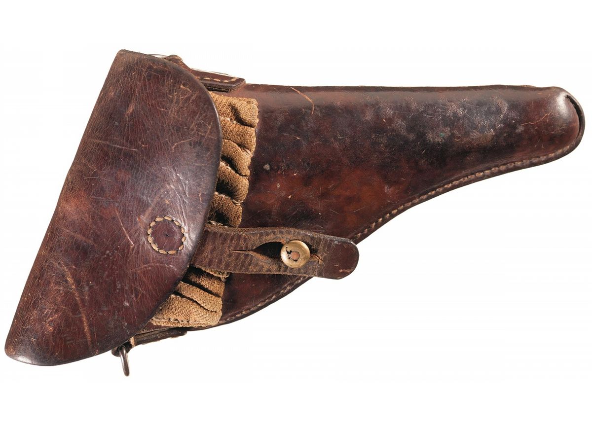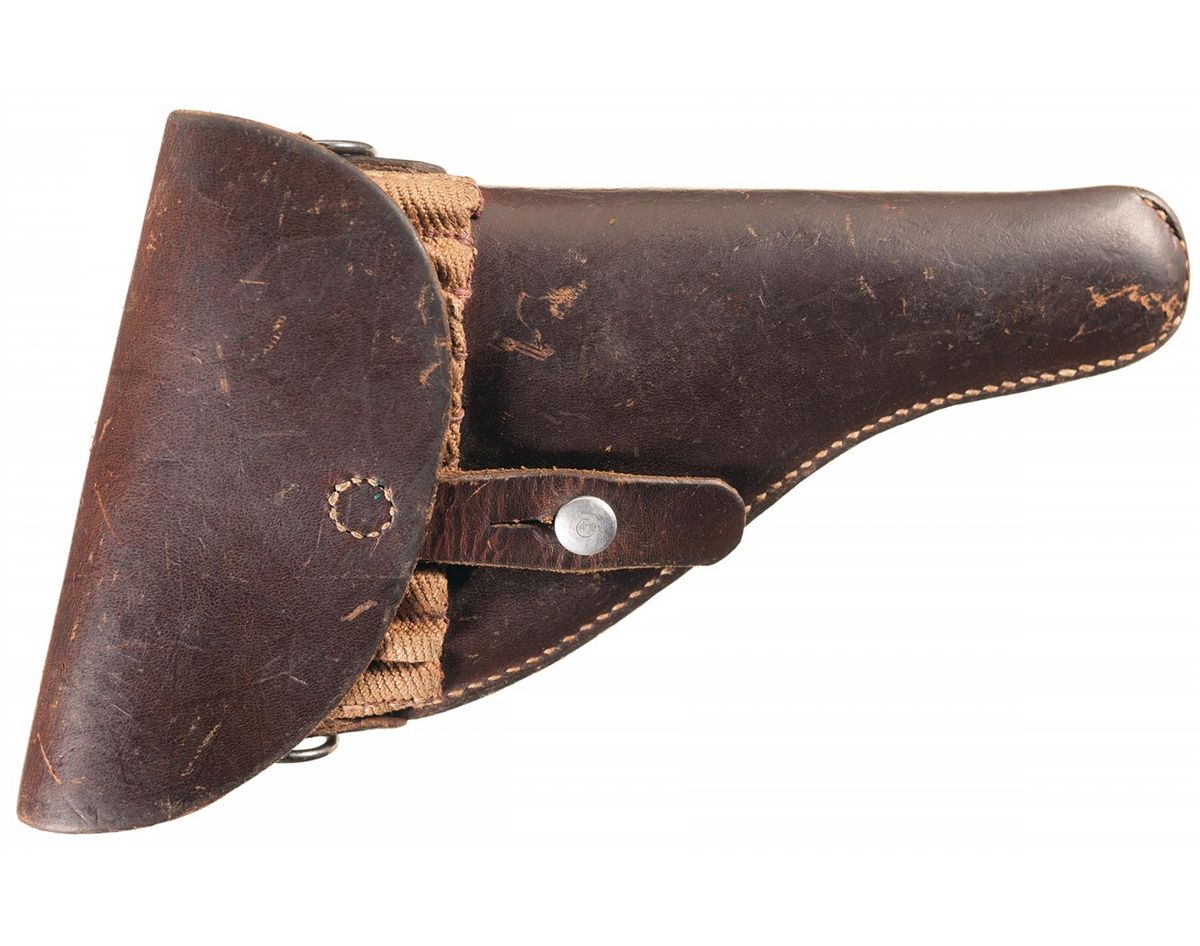 Excellent, with 95% of the original blue finish, showing a few areas of brown patina, mild spotting and scattered handling marks. Bright straw color is present on the hammer and trigger. Grips are excellent, with light dents and crisp checkering. Import marks are present on the underside of the barrel. Holster is fair, with some scuffs and tears. Mechanically excellent.