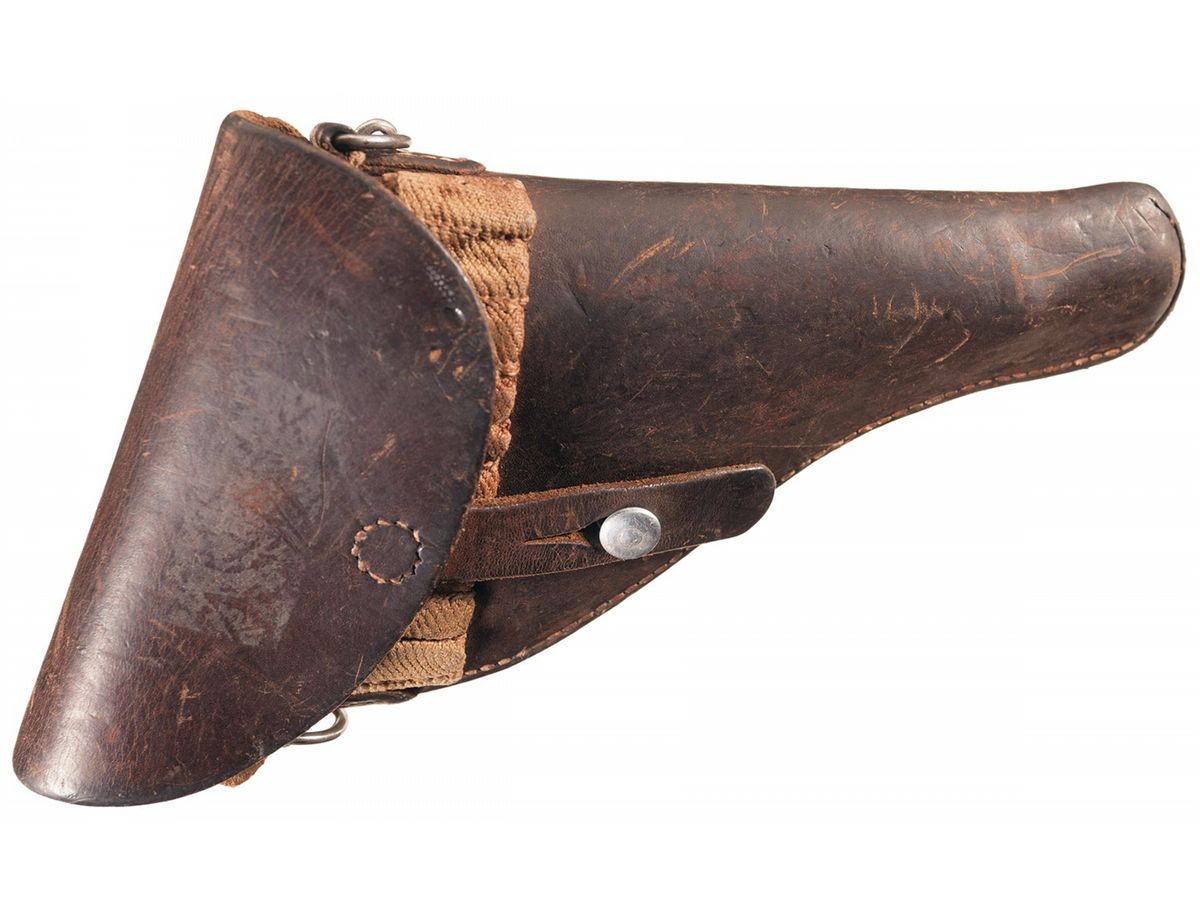 A) "P 52" stamped on the frame, matching numbers on the barrel, frame, ejector head, cylinder pin, cylinder, loading gate, trigger and hammer, and "702" on the barrel, ejector, loading gate and trigger. Checkered grips, with a Swiss Cross on the left, shoulder stock slot, and lanyard ring. With a brown leather holster marked "M.STEINER/19 SATTLER 40/BALLWIL".