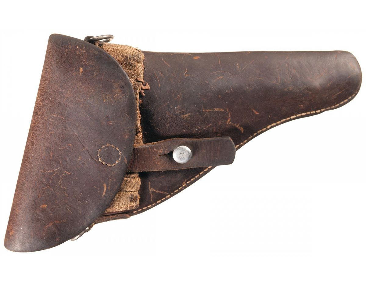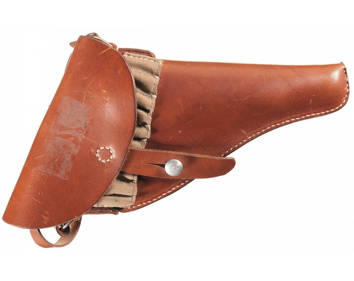 Excellent, with 95% of the blue finish, showing some bright edge wear and mild handling marks. Bright straw colors are present on the hammer and trigger. Grips are good, with some dents and varnish loss. The holster is very fine, with a dark color, minor scuffs and tight stitching overall. Mechanically excellent.