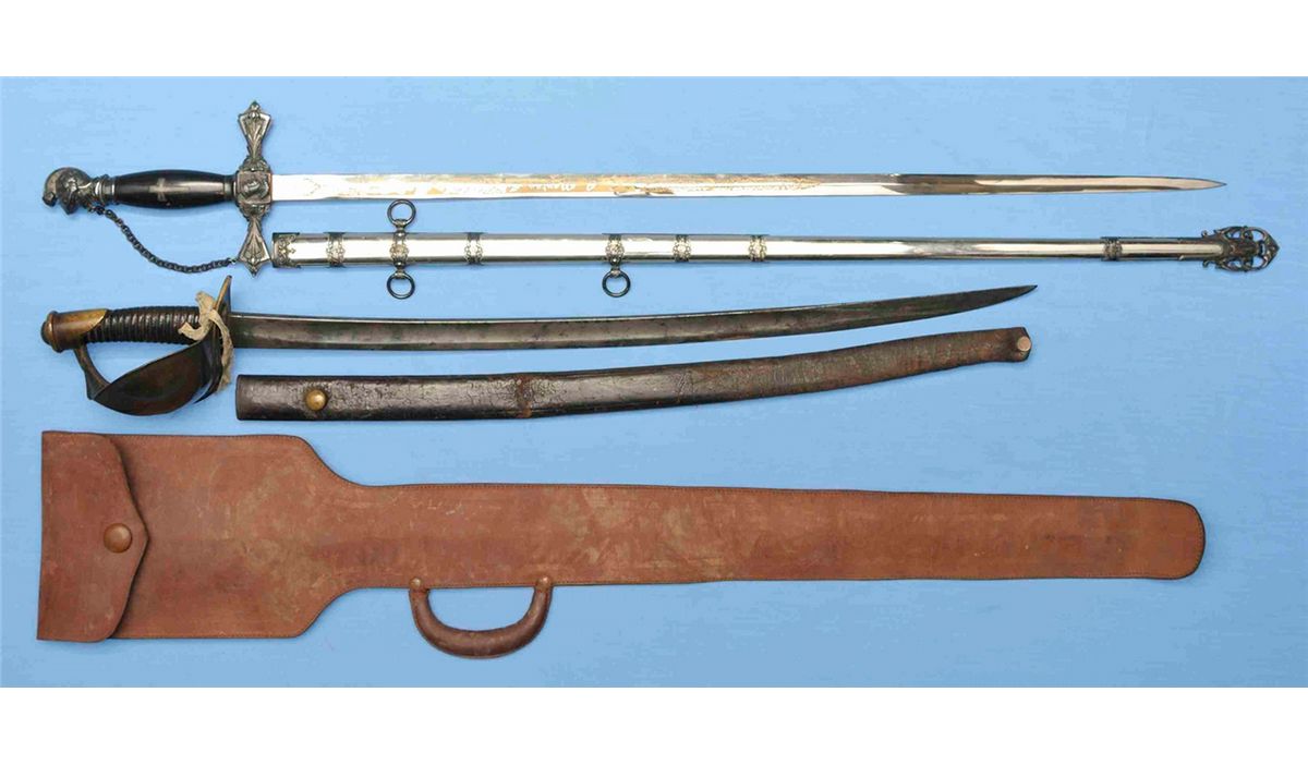 1) Masonic Knights Sword with a 31 inch blade, scabbard, and cloth case. 2) U.S. Naval sword with a 25 3/4 inche blade and leather scabbard. 3) Leather case measures 37 1/2 inches and has a broken handle. CONDITION: Fair or better overall with some wear and tear on the leather.