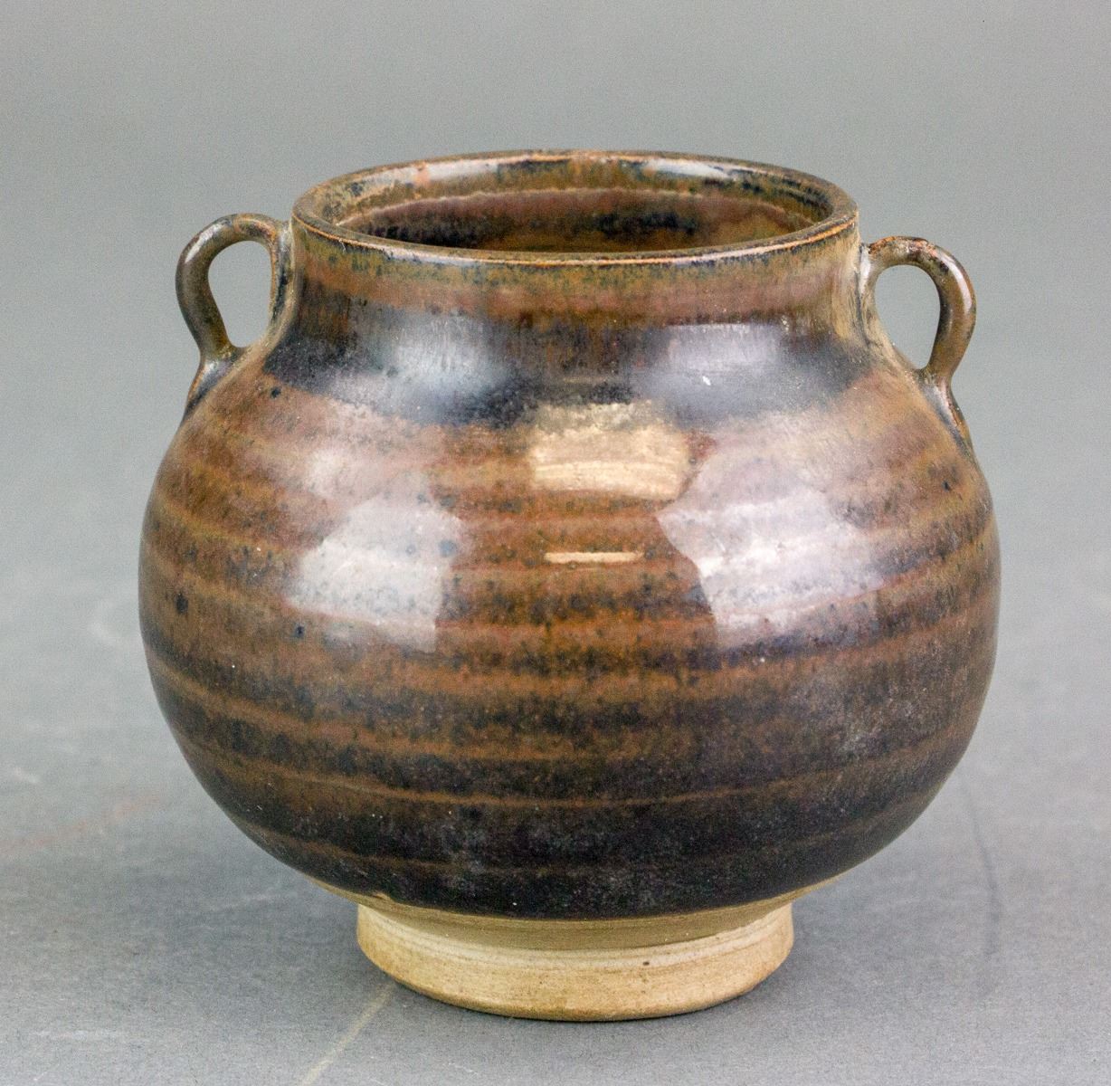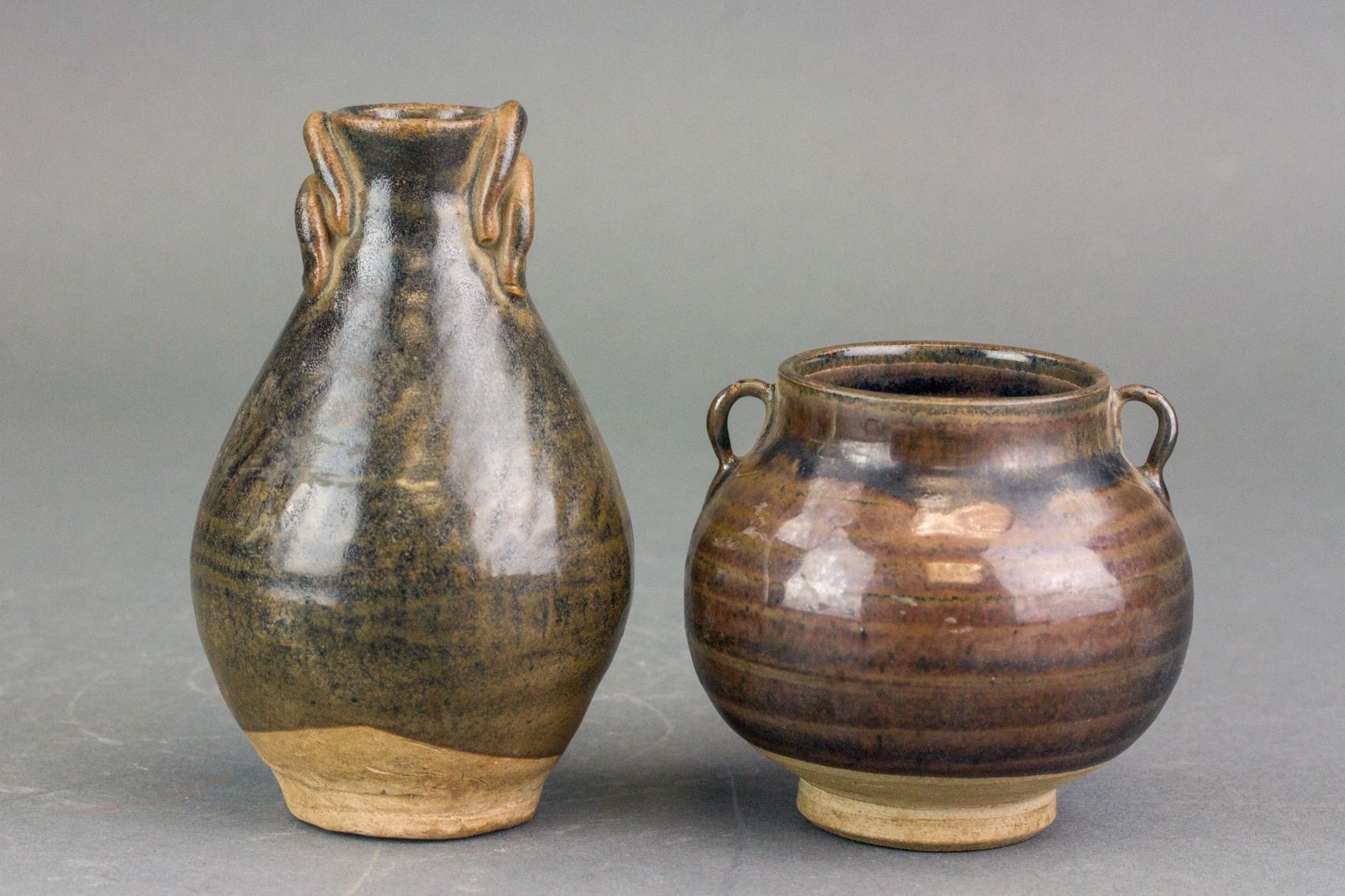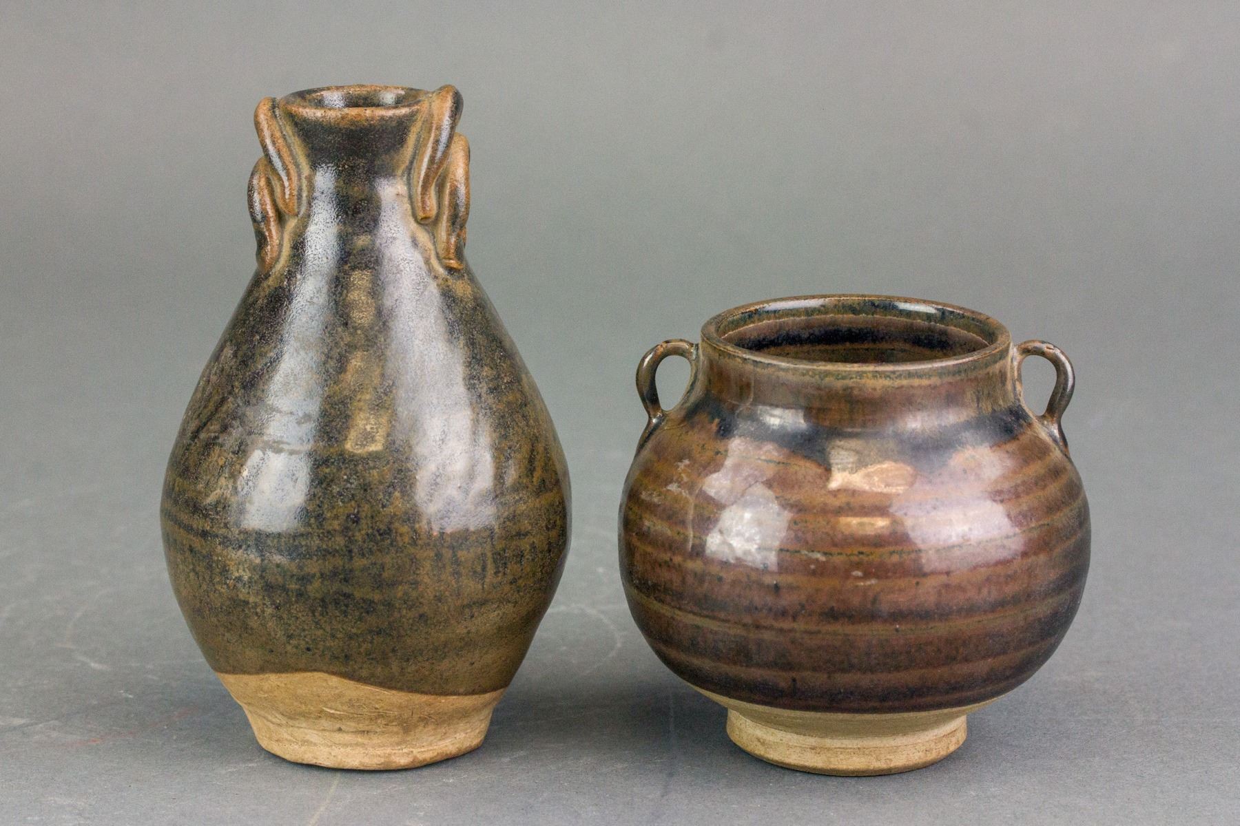 Two pieces of Tang style pottery jars; comprised of one pear-shaped jar and one globular jar; both set with loop handles on mouth rim; covered in dark brown glaze; H: 8.5-10 cm, W: 6-7.5 cm, 282 grams total